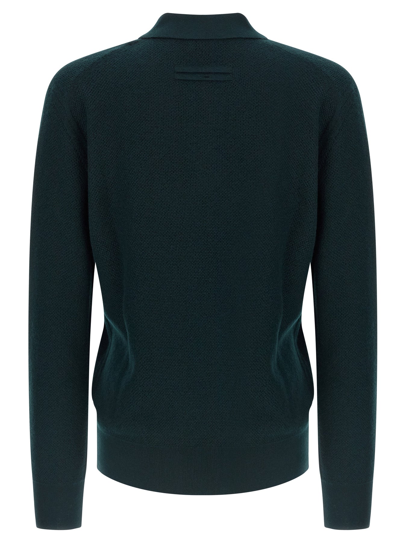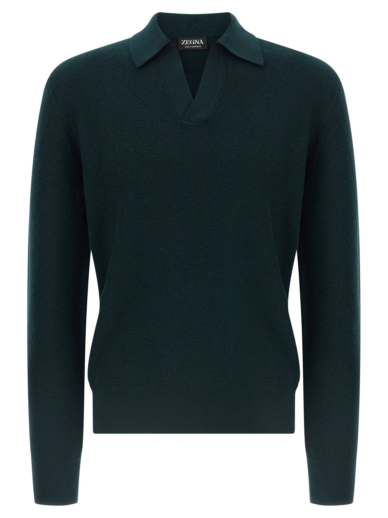 Jacquard cashmere oasis polo shirt, V-neck, collar, long sleeves with cuffs and dropped shoulder.