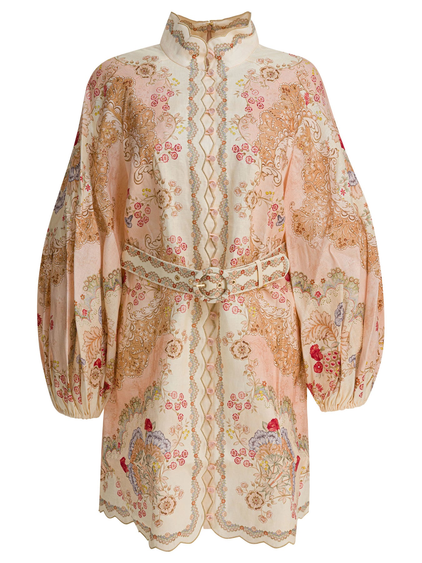 Zimmermann "Daylight" dress, made of linen, features a chemisier construction with mini structure and raised collar. The silhouette is defined by the removable belt with buckle appliqué at the waist. The front features central rouleau buttons, while the back closure is by a concealed zipper. Long puff sleeves and a flared skirt complete the garment. || - Floral - Chemisier dress - Flared skirt - Puff sleeves - Long sleeves - Raised collar - Rouleau buttons all over the front - Concealed back zipper closure - Removable belt with buckle - Regular fit