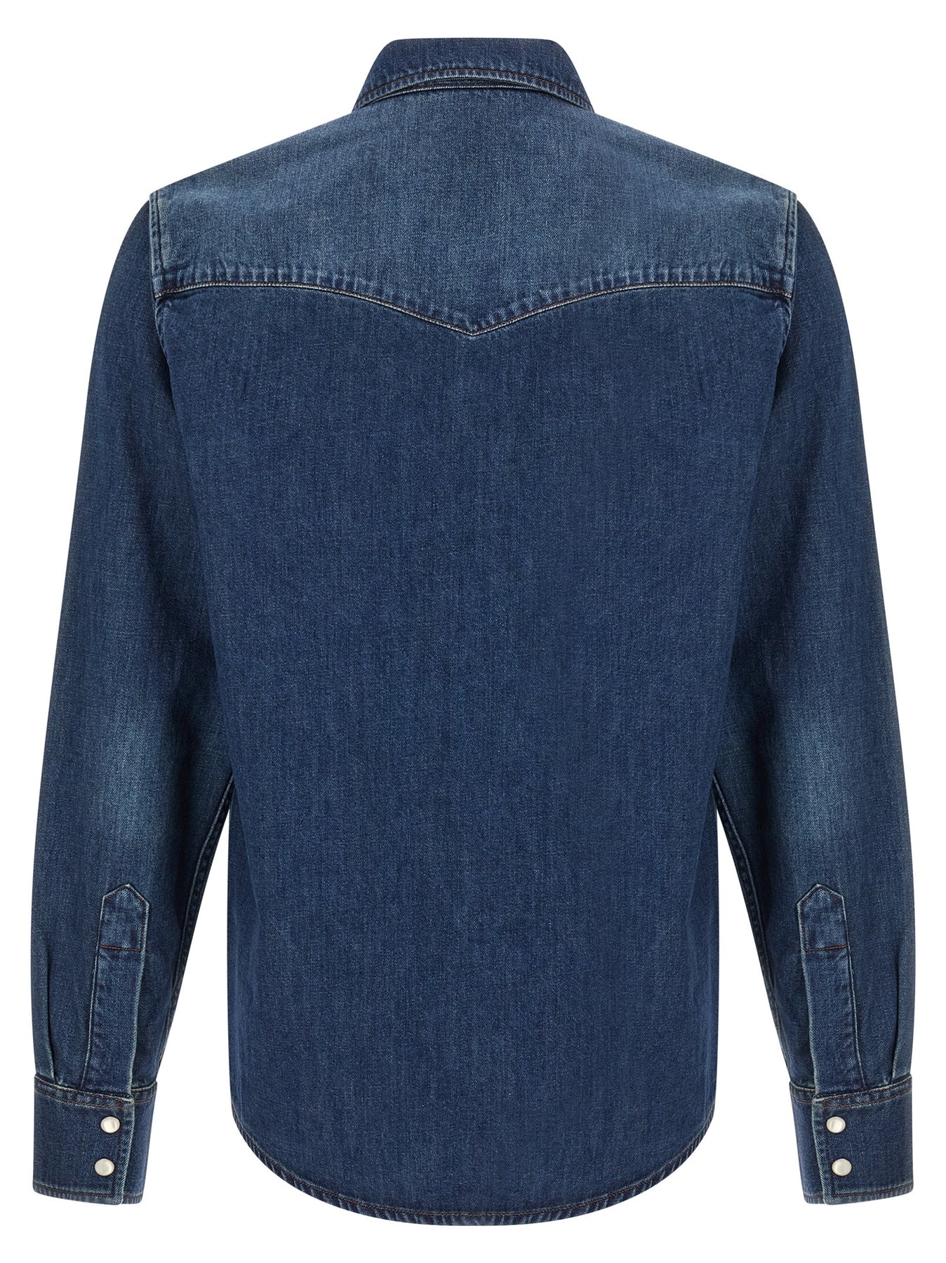 'Western' shirt in delavé cotton denim with contrast stitching, pointed collar, front snap button closure, pockets, long cuffed sleeves, rounded hem. SUSTAINABLE: This product is made with organic cotton.