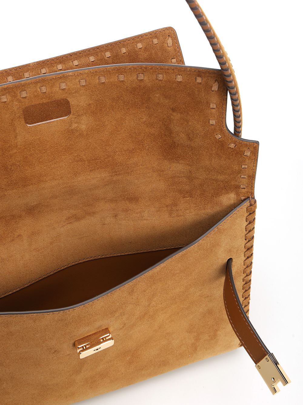 Tory Burch's "Lee Radziwill" large suede shoulder bag features a structured shape, a T-buckle closure, smooth snap buttons along the shoulder strap for adjustment, a leather top handle, a front compartment, and an interior zip pocket.