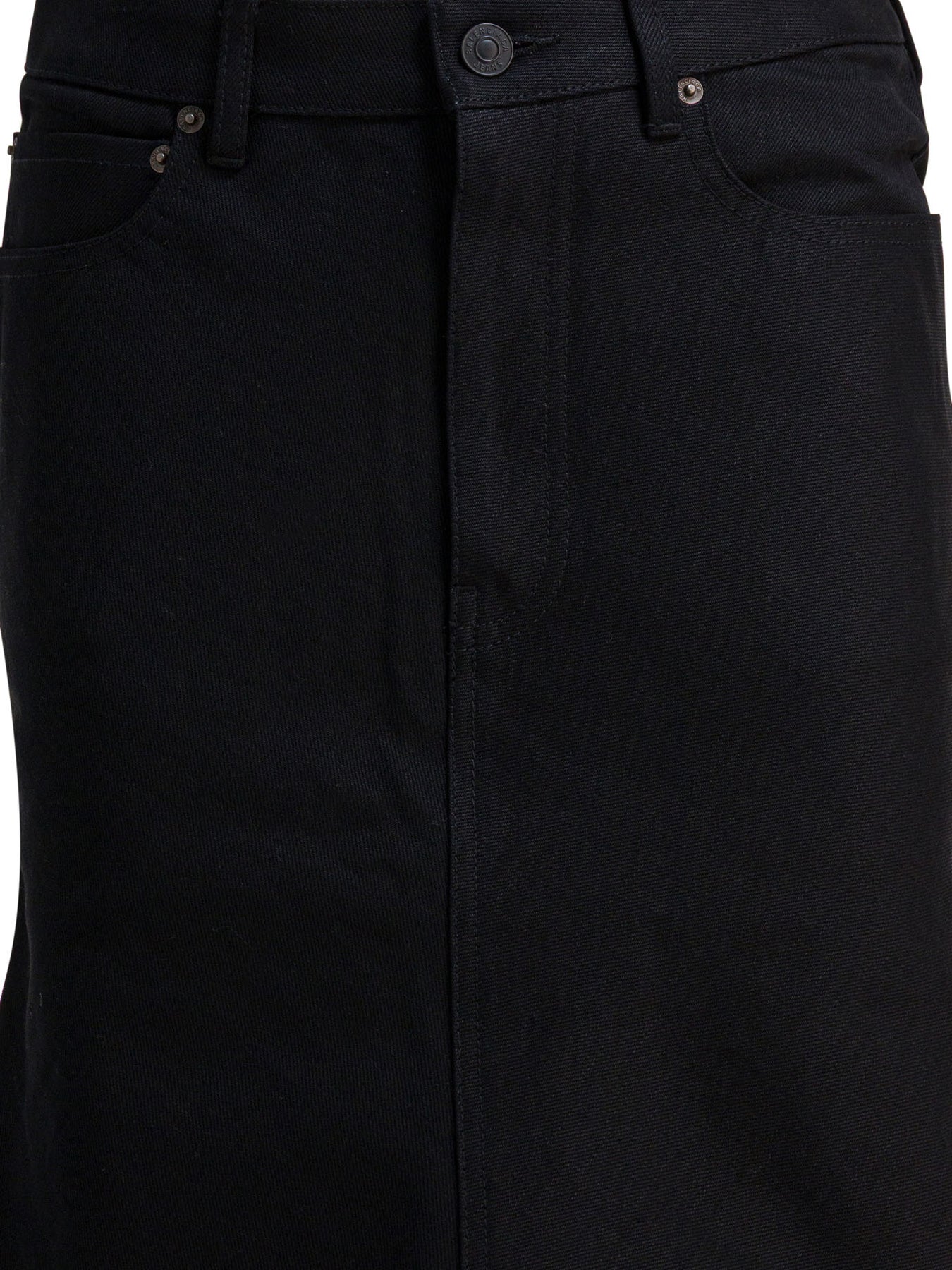 Balenciaga "Godet" Midi Skirt, made of cotton denim with washed and worn effect processing. The structure features a flared silhouette with a godet hem, mid-rise waist and five waist loops. The closure is entrusted to a concealed zipper flap, while the five-pocket construction completes the functionality. The cotton composition lends solidity and textural character to the garment. || - Solid color - Flared - Mid-rise - Cotton denim - Washed and worn effect - Concealed zipper fly - 5 waist loops - 5 pockets - Godet hem - Regular fit