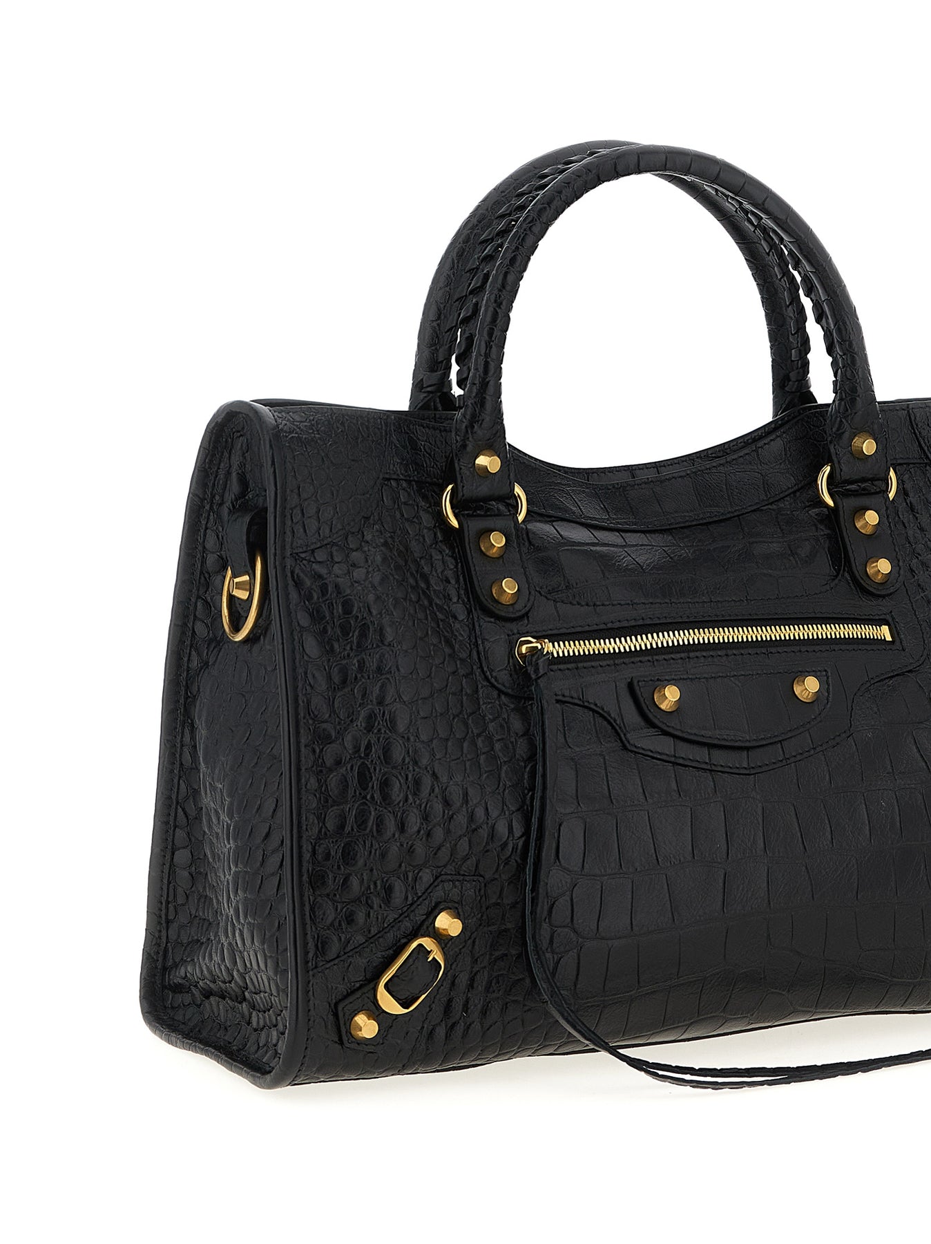 'Le City Bag M' leather handbag with crocodile processing, double fixed handle, top zip closure, brass-finish studs, front zip pocket, adjustable and removable shoulder strap.