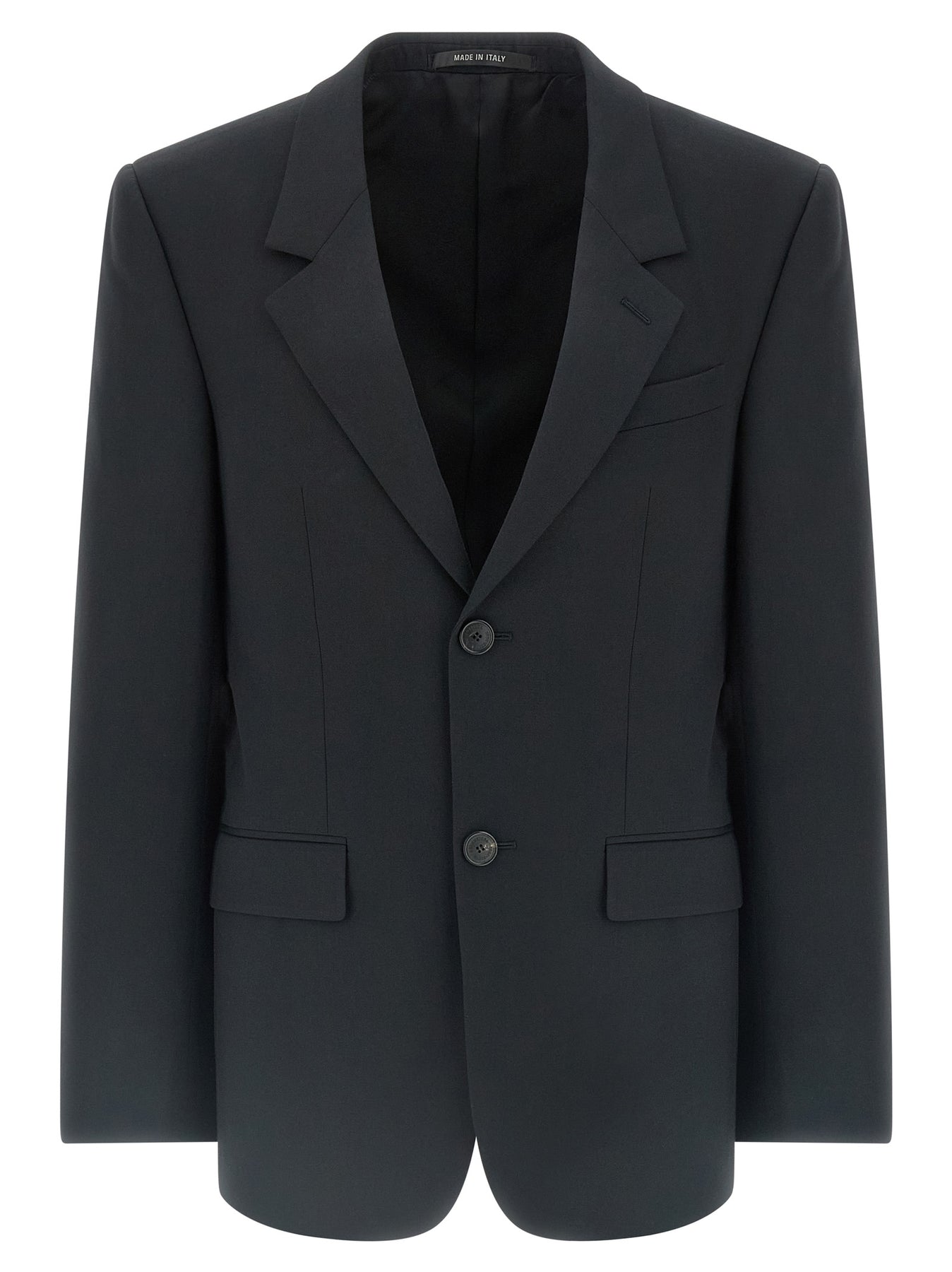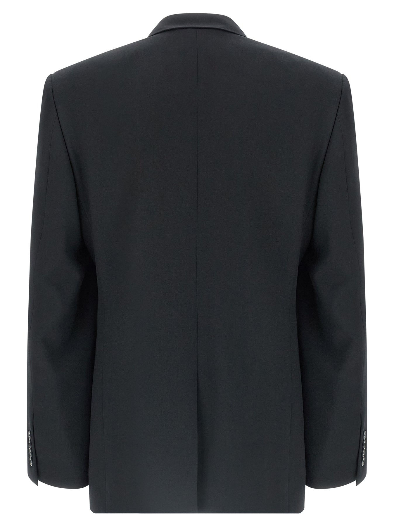 'Sartoriale Standard' single-breasted blazer in new black wool with two front button closure, mirror lapels, breast pocket, flap pockets, structured shoulder strap, opening buttonhole cuffs, back split, monogram cupro lining.