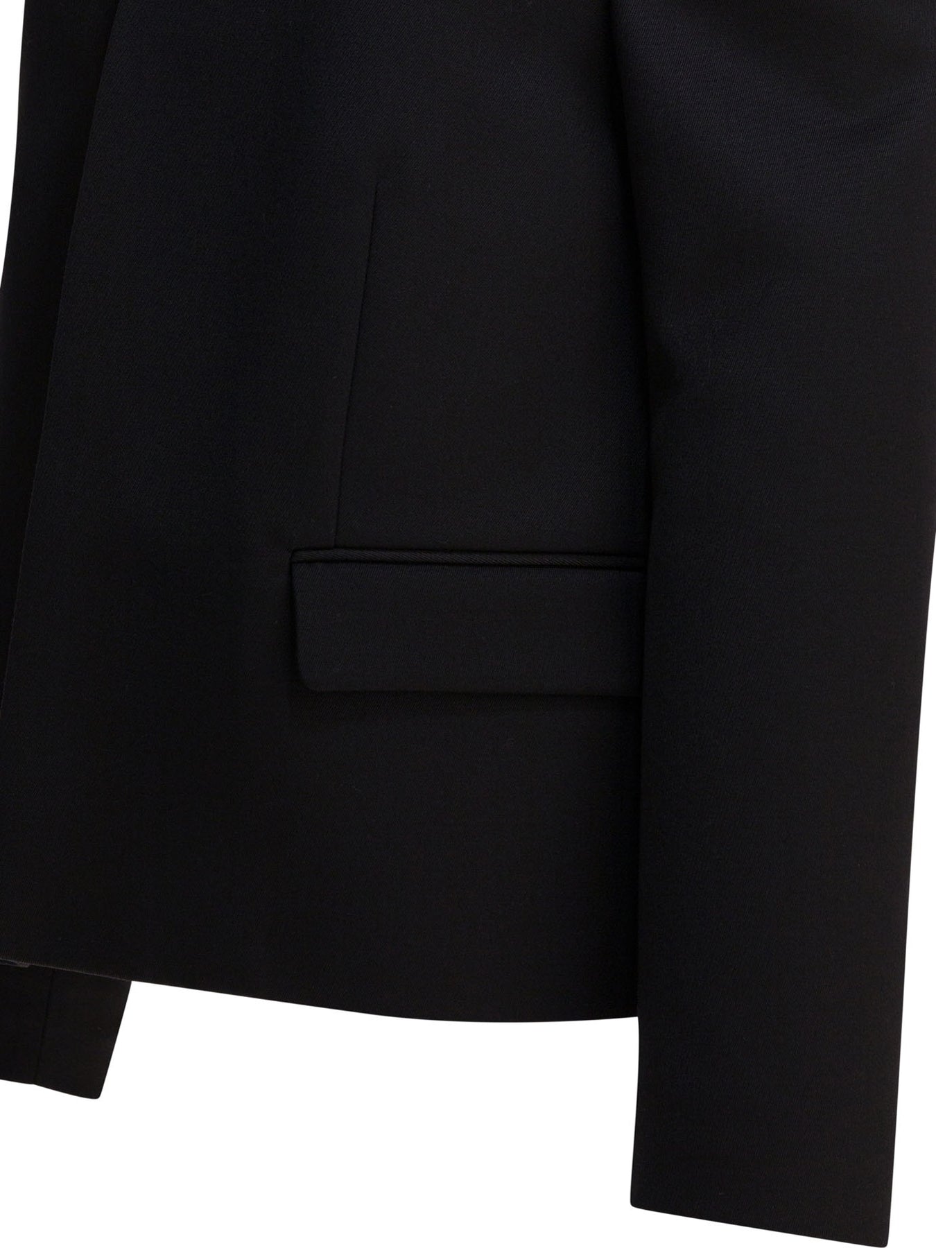 Balenciaga wool jacket, structured construction and short trapeze silhouette. The structure features defined volumes and sharp lines, characterized by tailoring. The garment is made of wool, with a cut that favors the architectural shape and creates a contrast between minimal length and side width. The tailoring emphasizes the solidity of the jacket while maintaining a uniform and compact surface. || - Solid color - Long sleeves - Short, trapezoidal silhouette - Stiff structure and defined volumes - Regular fit