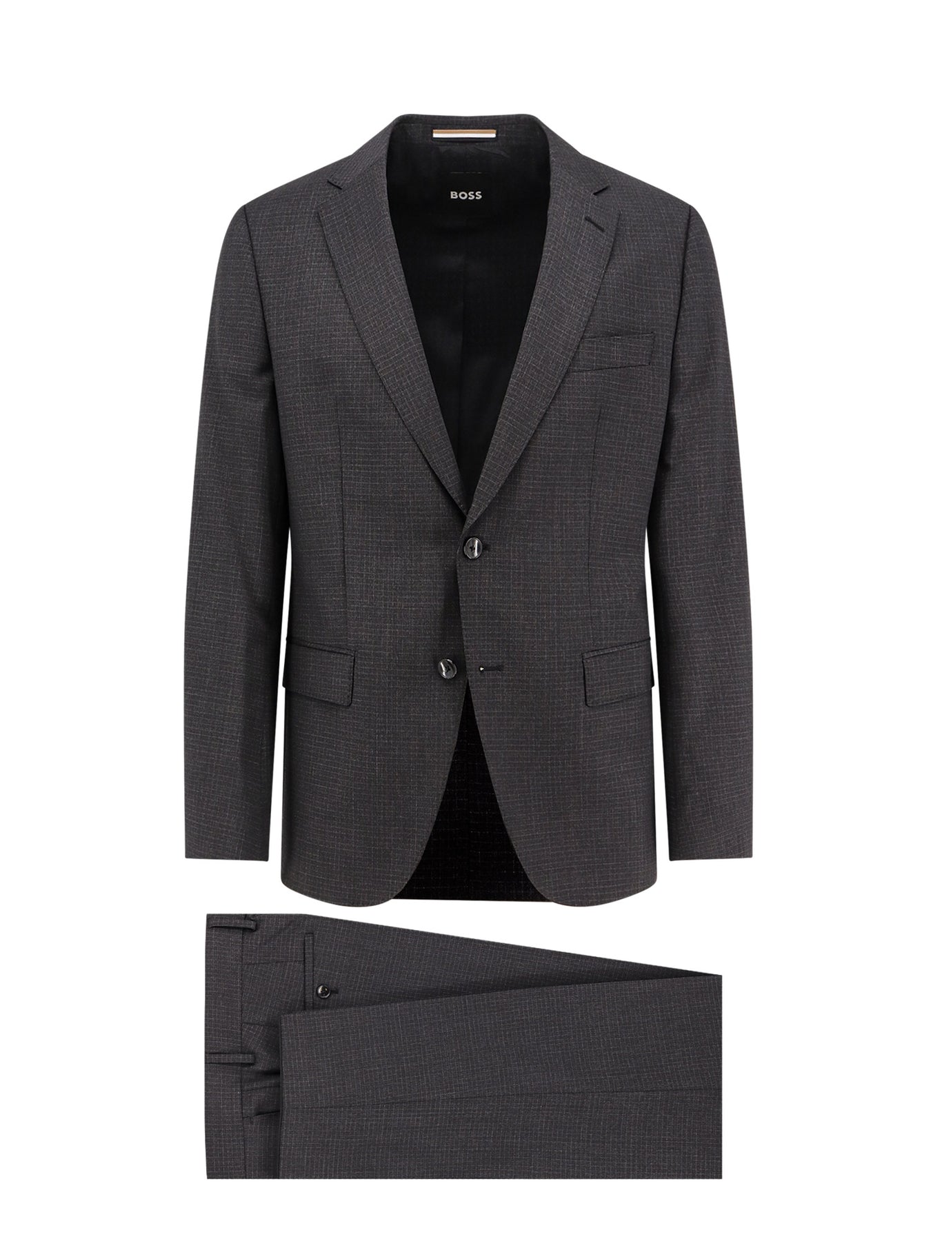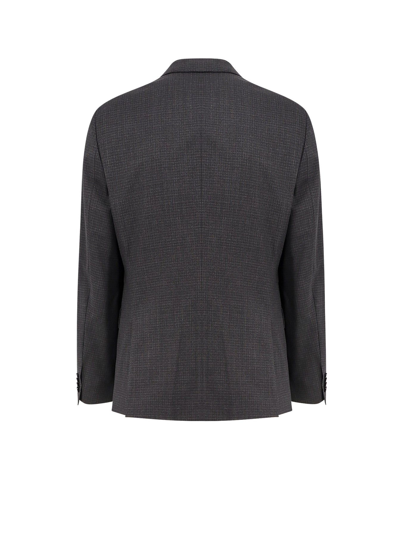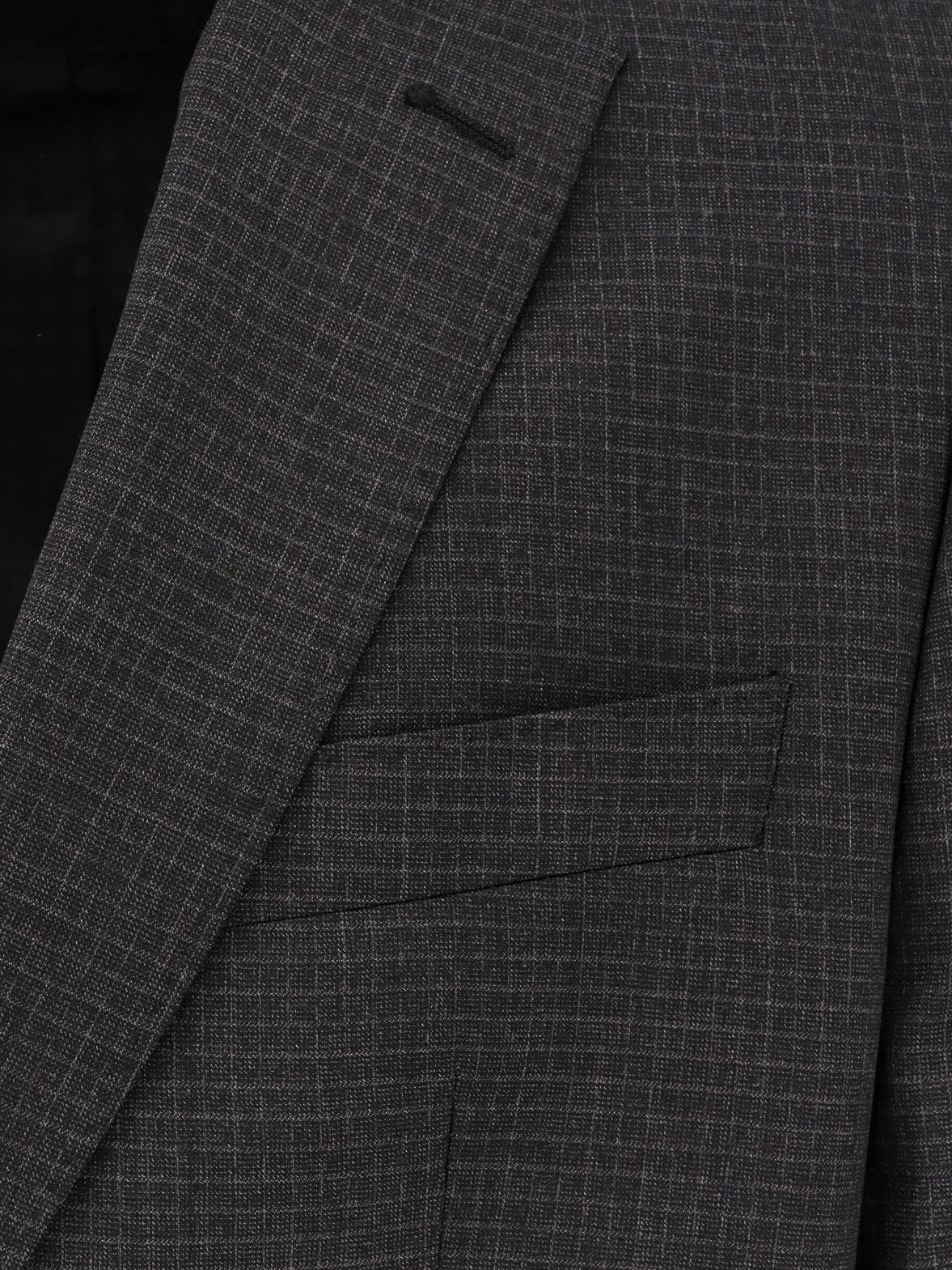 Blazer: Peak lapels Two flap pockets on the front and one breast pocket Trousers: Hook and zip closure Two slant pockets on the front and two buttoned welt pockets on the back 100% wool Lining: 65% viscose 35% polyester SKU: 50528117_030