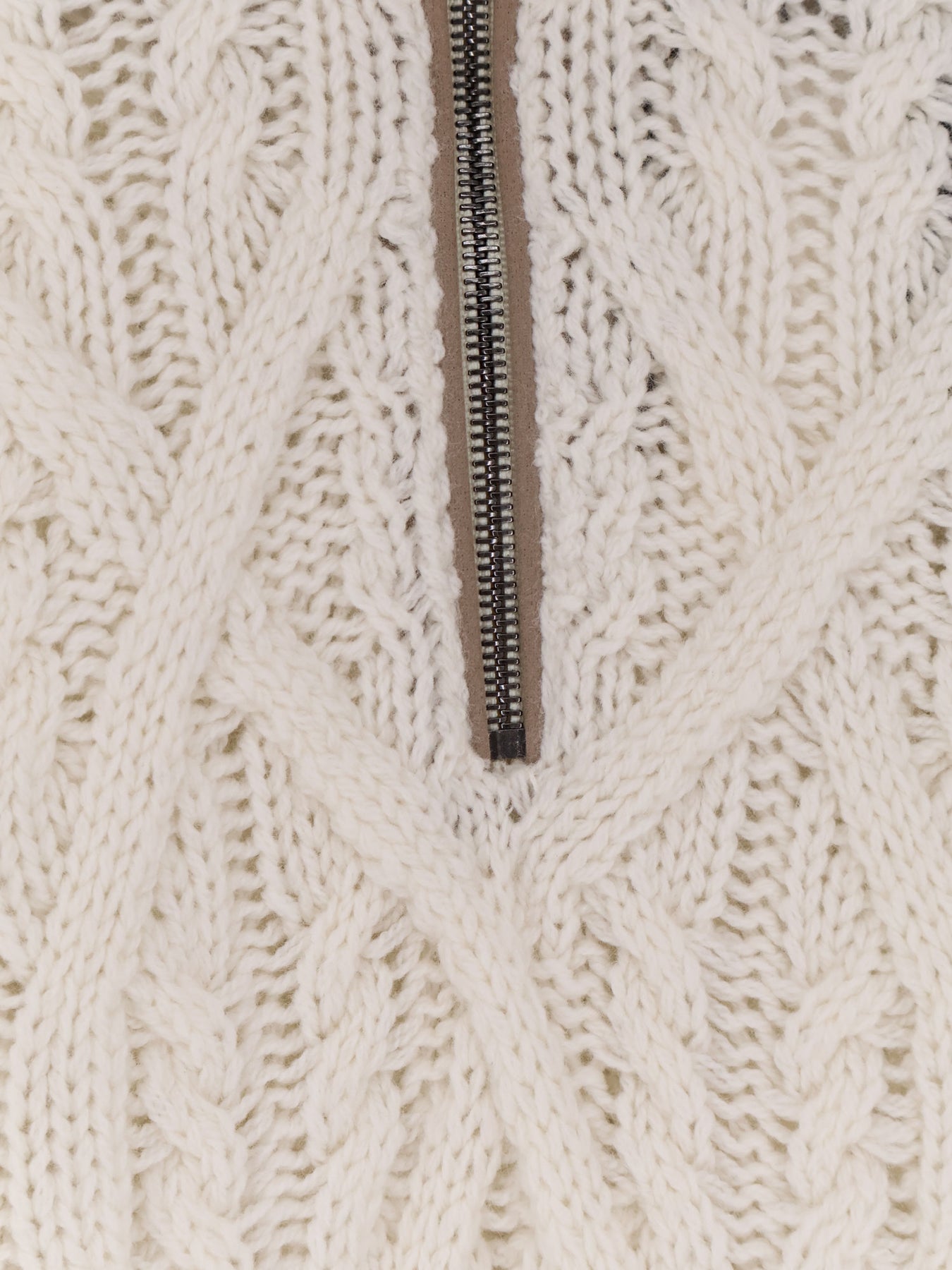 Ribbed turtleneck Zip closure with leather trim Cable knit Long sleeves with cuffs 70% virgin wool, 30% cashmere SKU: 50557441118