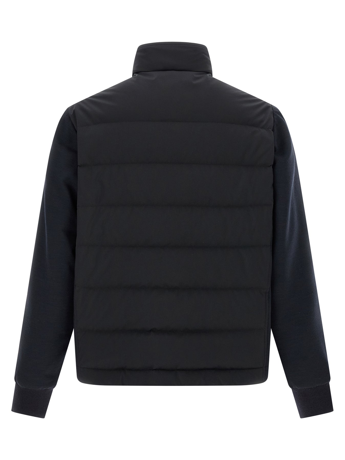 'Mix Material' slightly padded and quilted nylon and wool jacket, high neck, front zip closure, side logo, pockets, long cuffed sleeves.