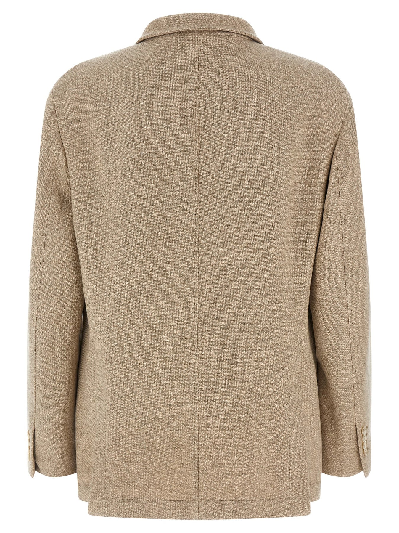Chiné jacket of cashmere and techno wool diagonally, blazer style, standing collar, front button closure, pockets, long sleeves, back slits, half cupro lining.