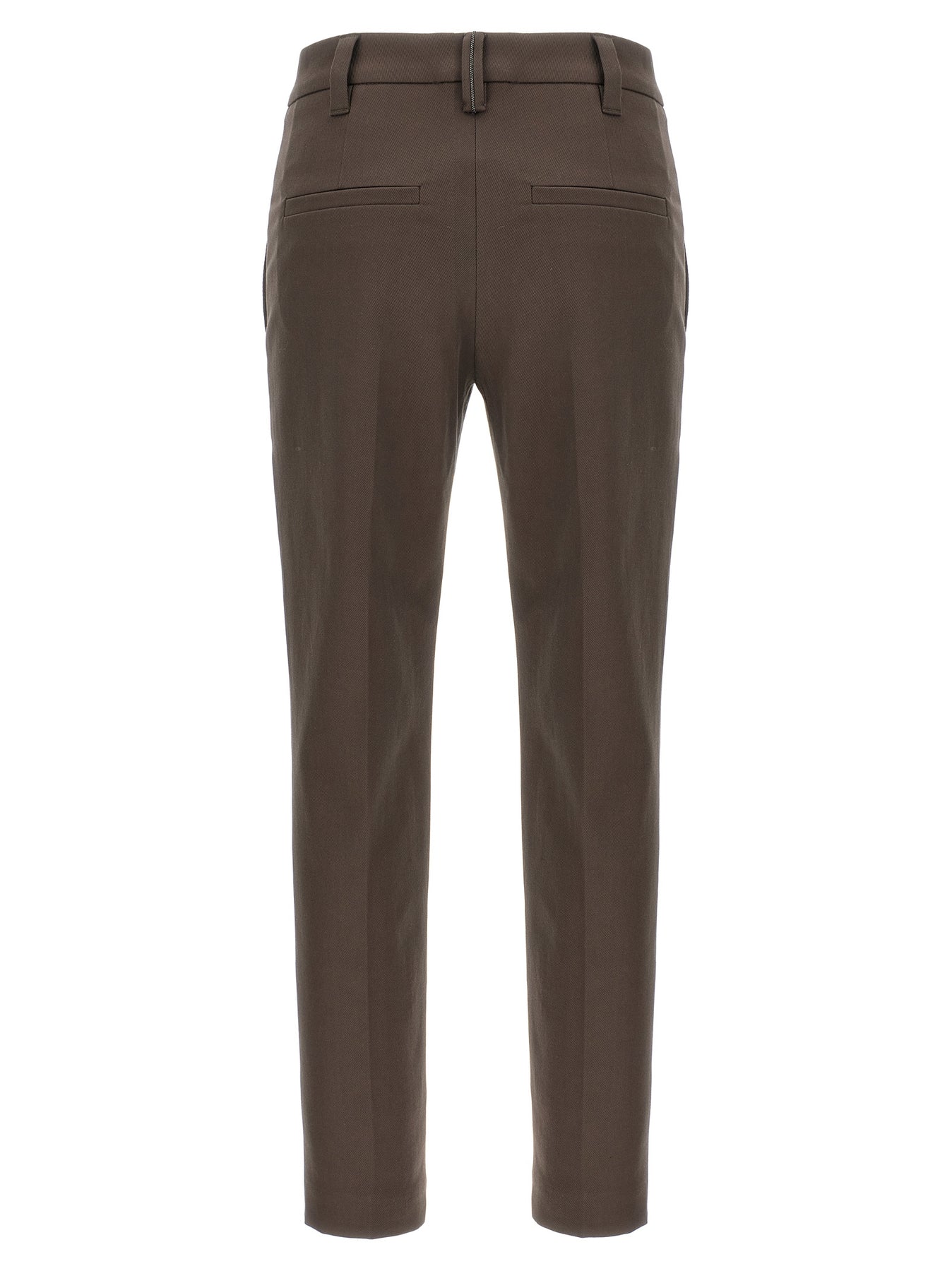 Cotton pants, crop model, stretched pleat, zip hook and button closure on the front, pockets, straight leg, back Monile detail.