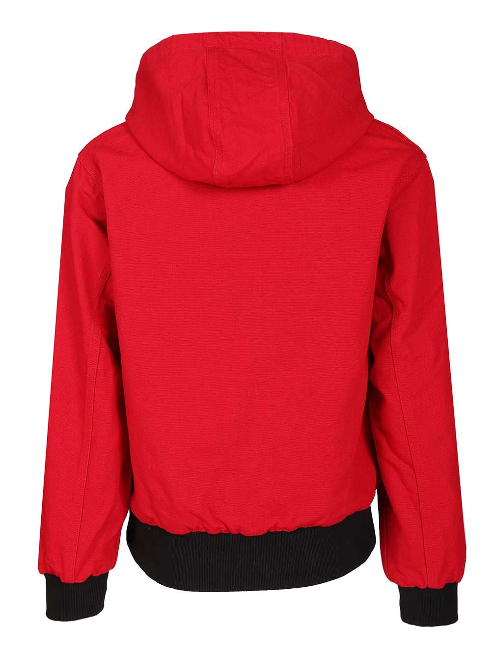Reversible cotton jacket with adjustable drawstring hood, gold-tone zip front closure, kangaroo pockets, and elasticated cuffs and hem for a secure fit. The iconic Carhartt 50th Anniversary patch.