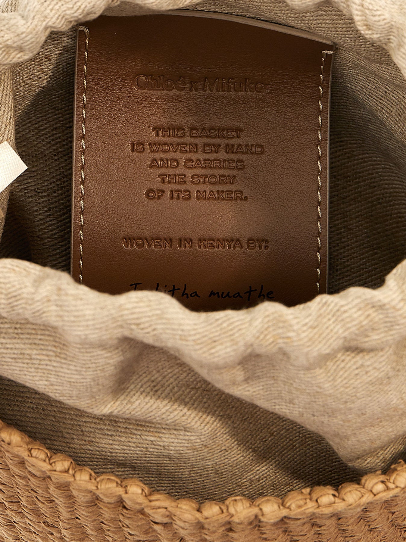 Woody small bucket bag in woven paper with leather details, embroidered tape with logo, drawstring closure, leather shoulder strap.