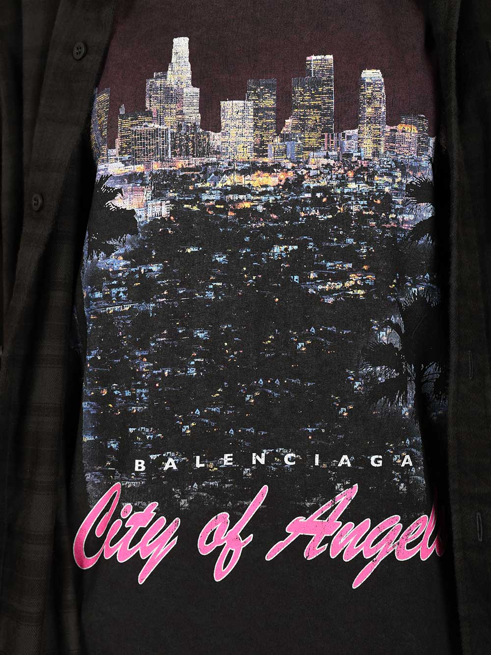 Cotton poplin shirt over a T-shirt, layered effect, shirt-style collar, front button closure, patch pocket on the chest. Long sleeves, buttoned cuffs, rounded hem, City of Angels motif printed on the T-shirt. Oversized fit.