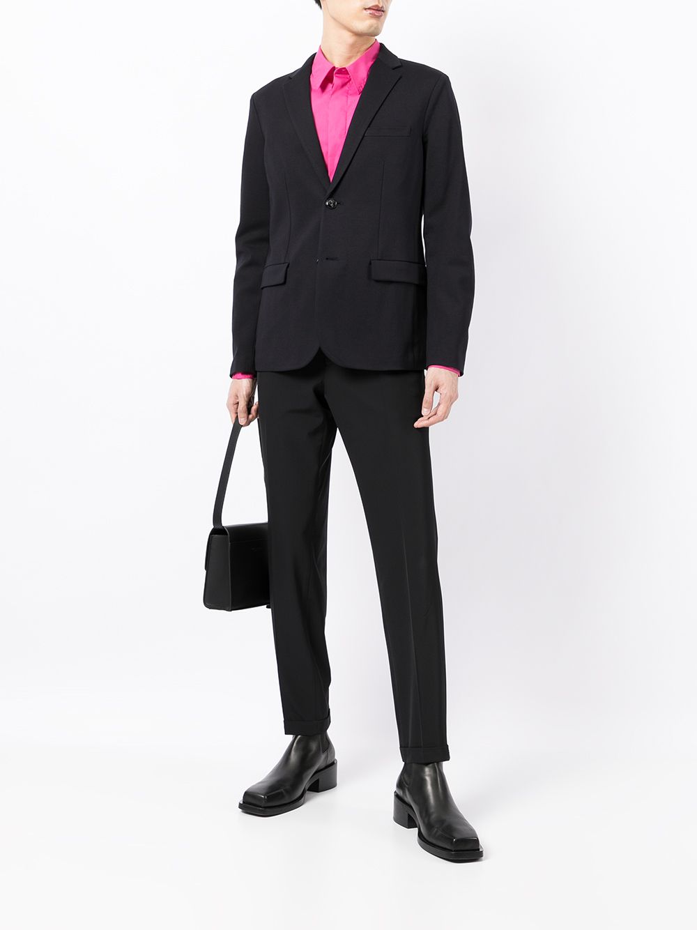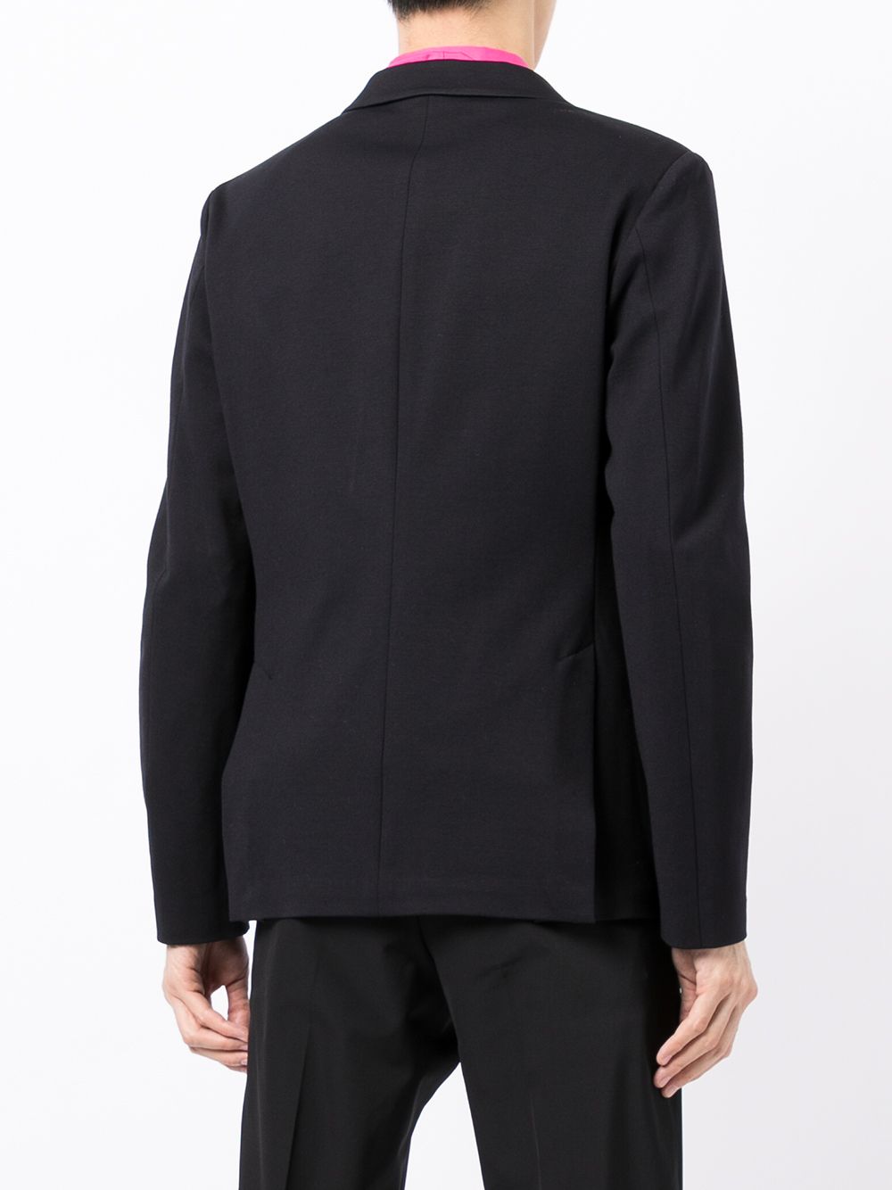 navy stretch-design dart detailing notched lapels chest welt pocket front flap pockets long sleeves English rear vents