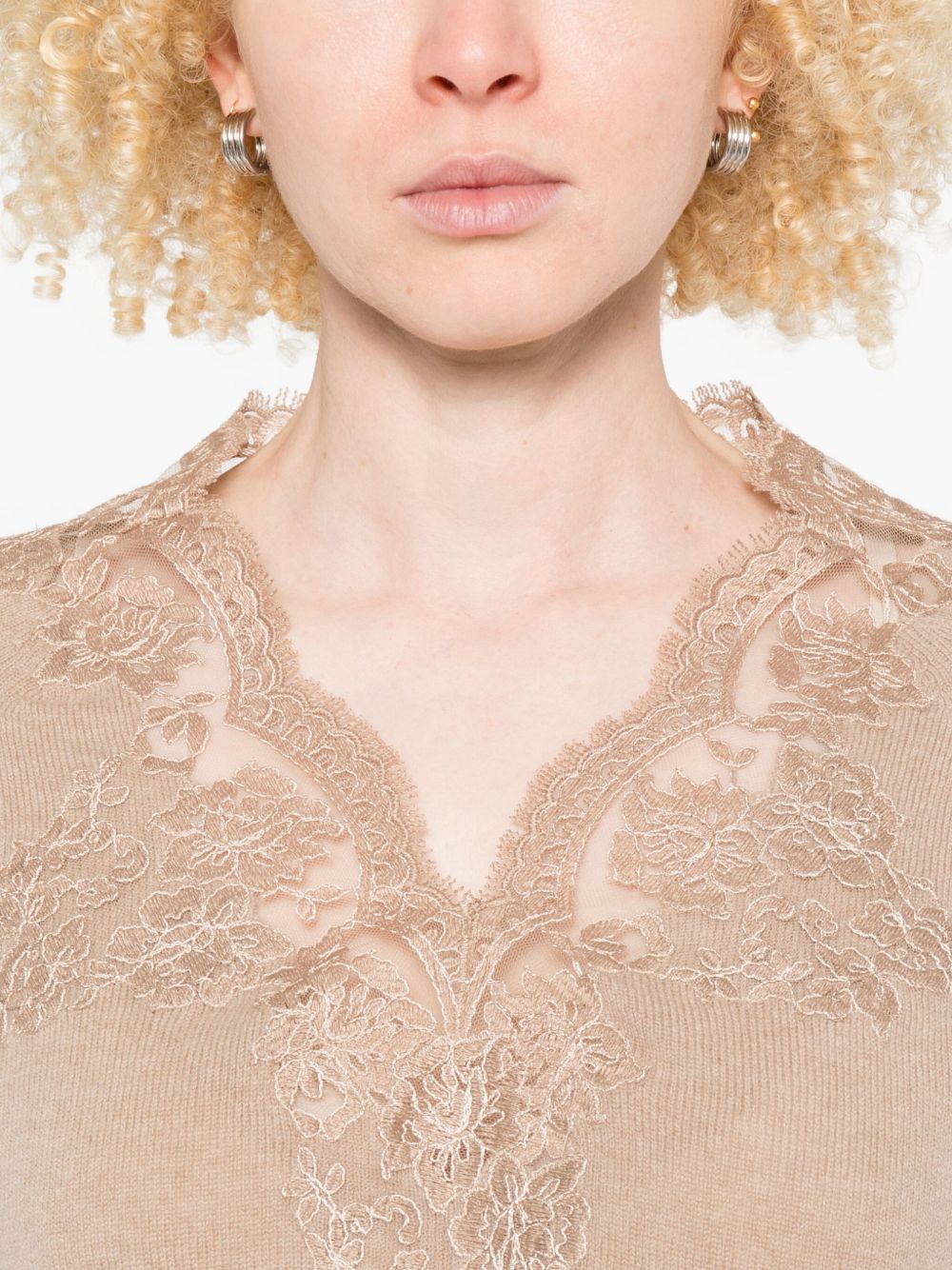beige v-neck lace embellishment ribbed cuffs and hem