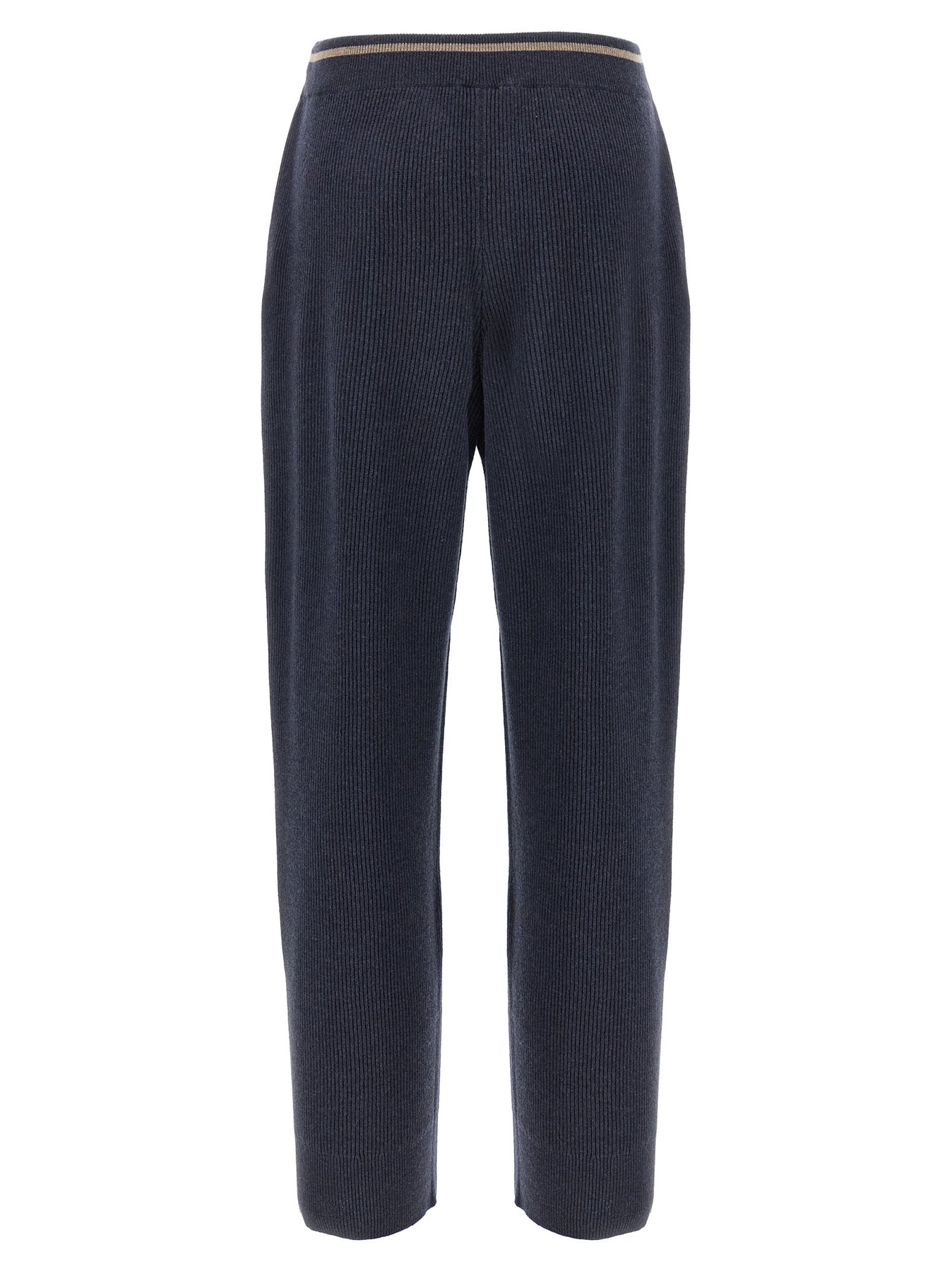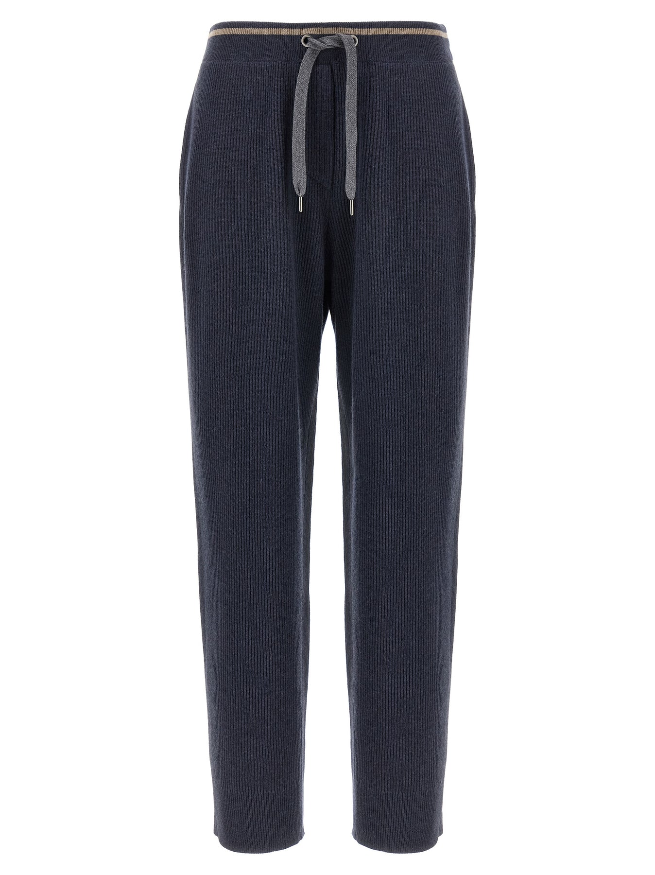 English rib knit cashmere and silk knit pants with contrast details, pull-up model, adjustable drawstring elastic at the waist, trompe l'oeil flap, pockets, straight leg.