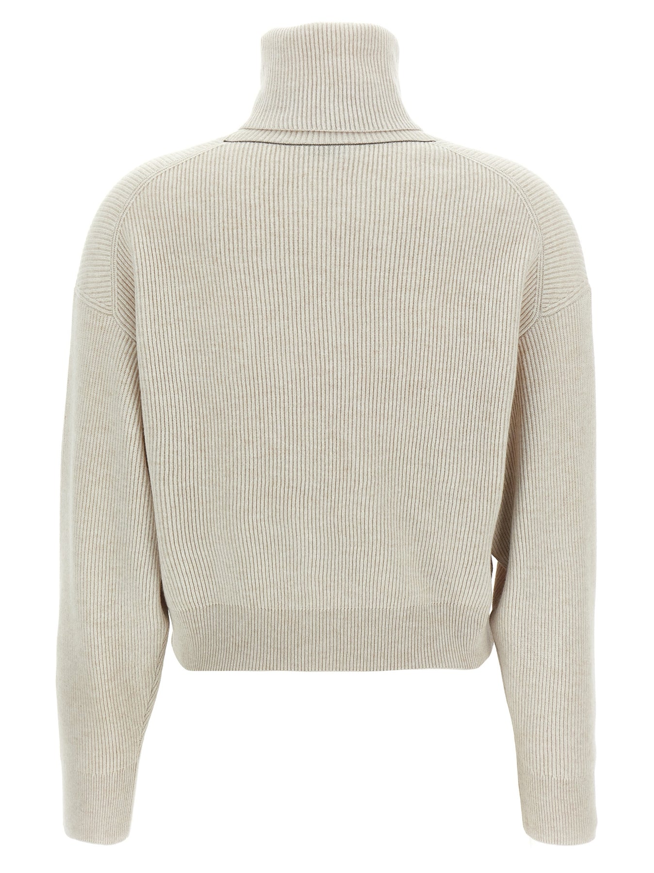 Ribbed wool blend turtleneck sweater, slightly cropped model, high neck with back Monile detail, long sleeves with cuffs and dropped shoulder.