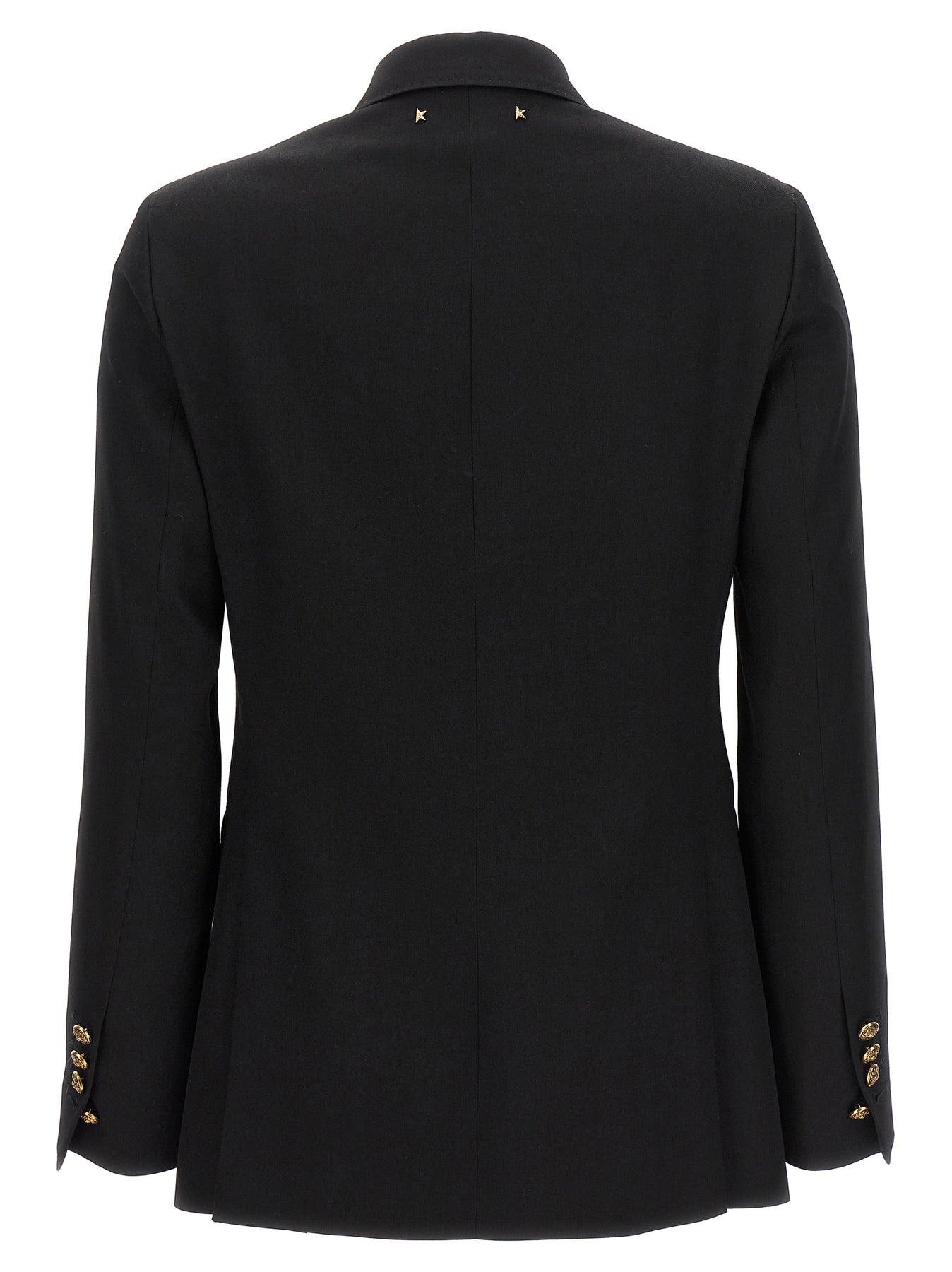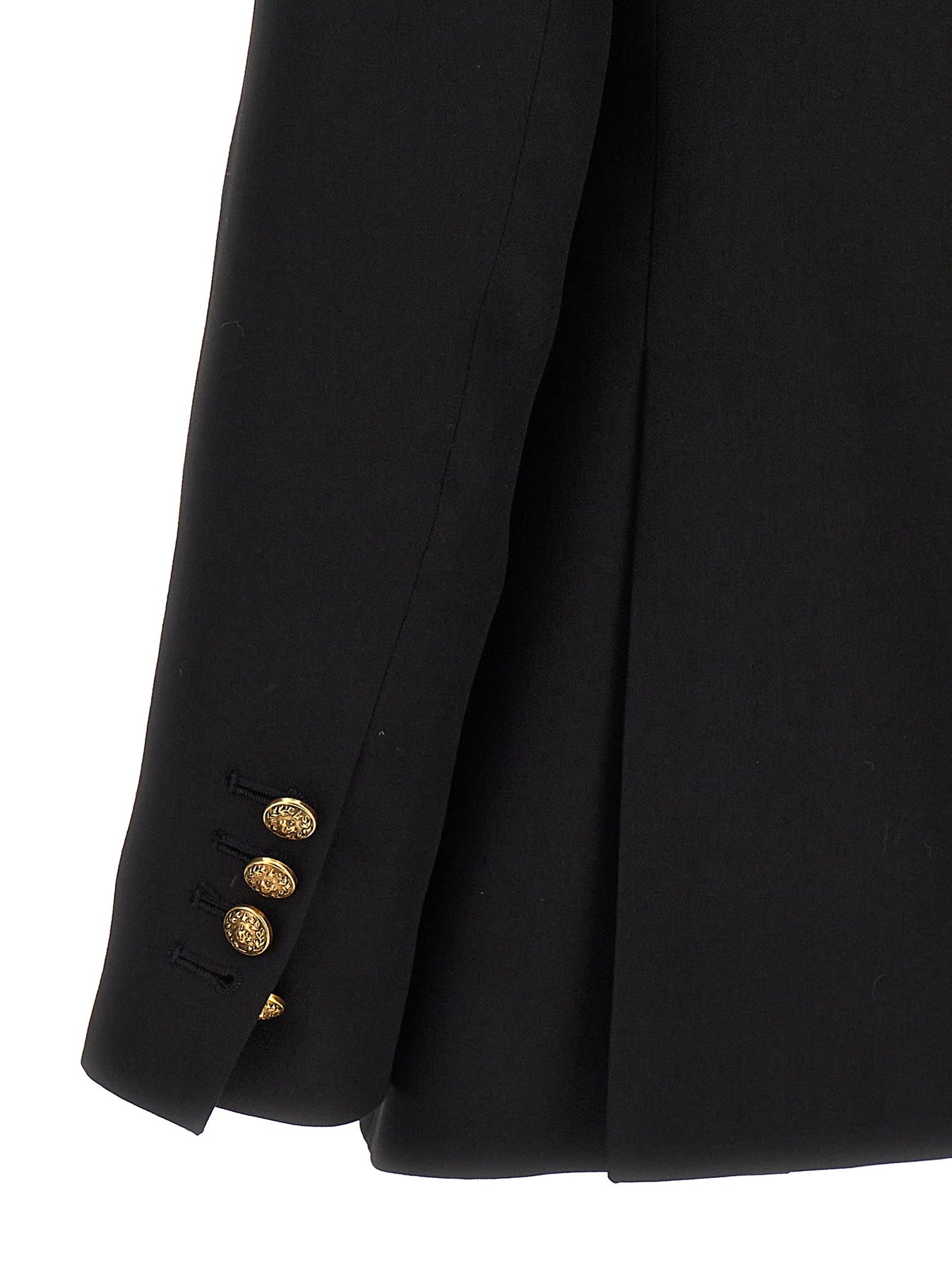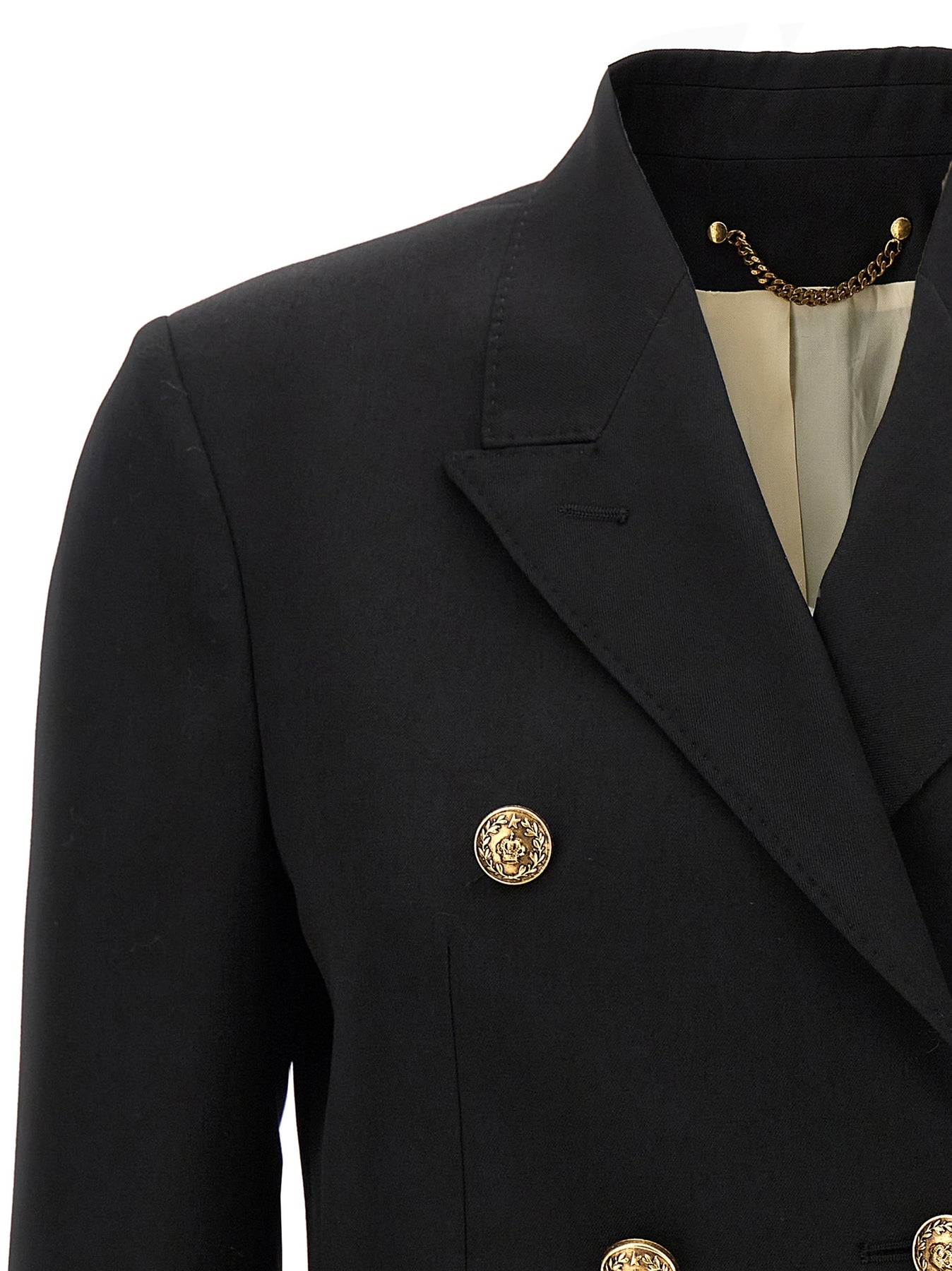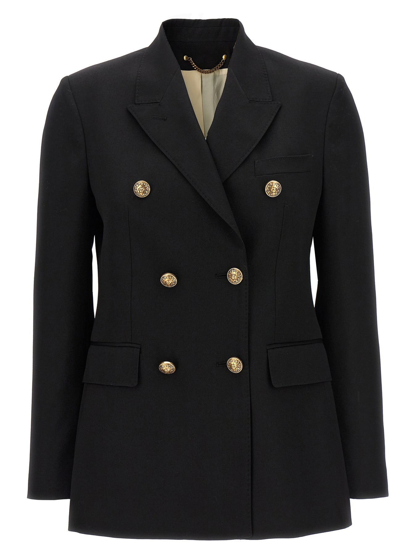 'Diva' virgin wool blazer, double-breasted style with front metal button closure, peak lapels, breast pocket, flap pockets, structured shoulder pads, long sleeves, metal logo, and back slits, viscose and cupro monogram lining.