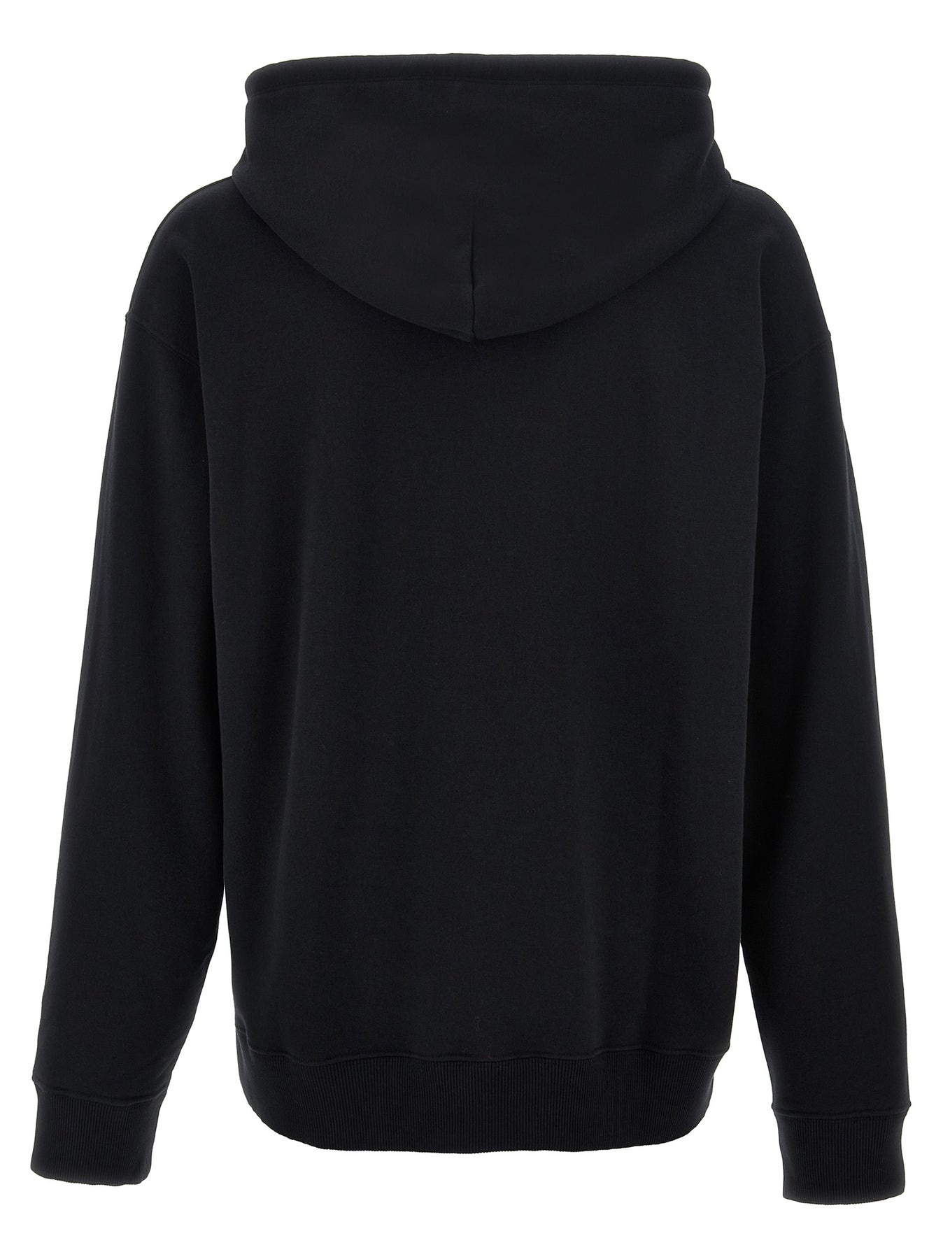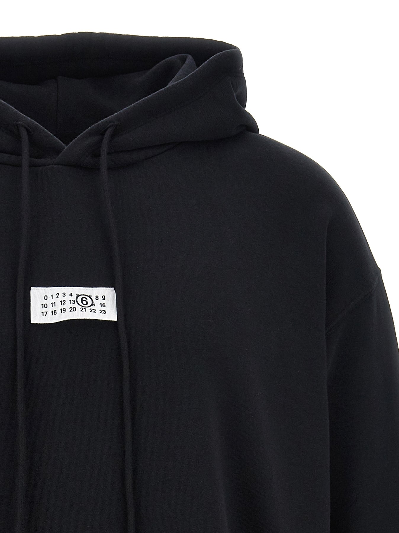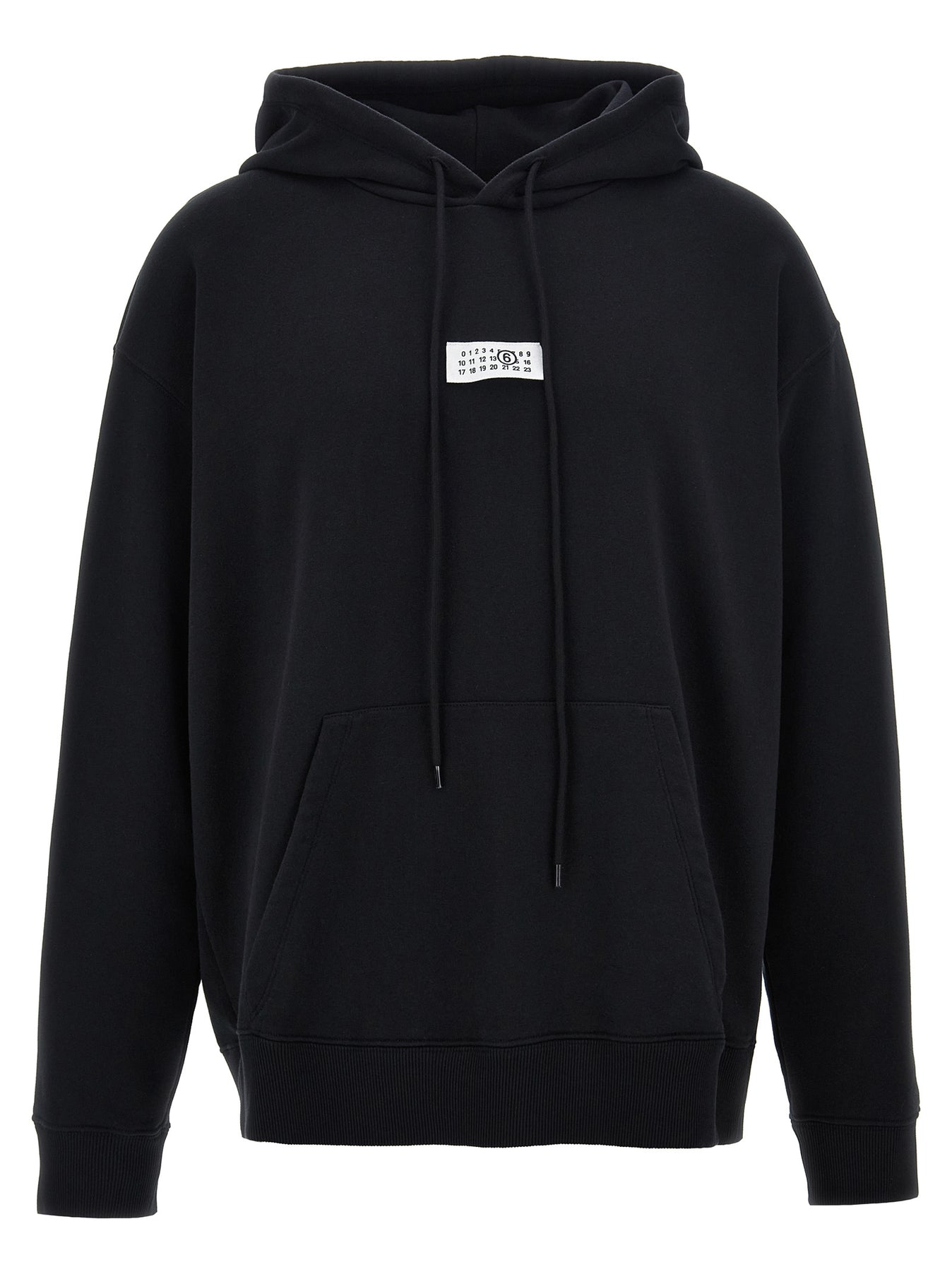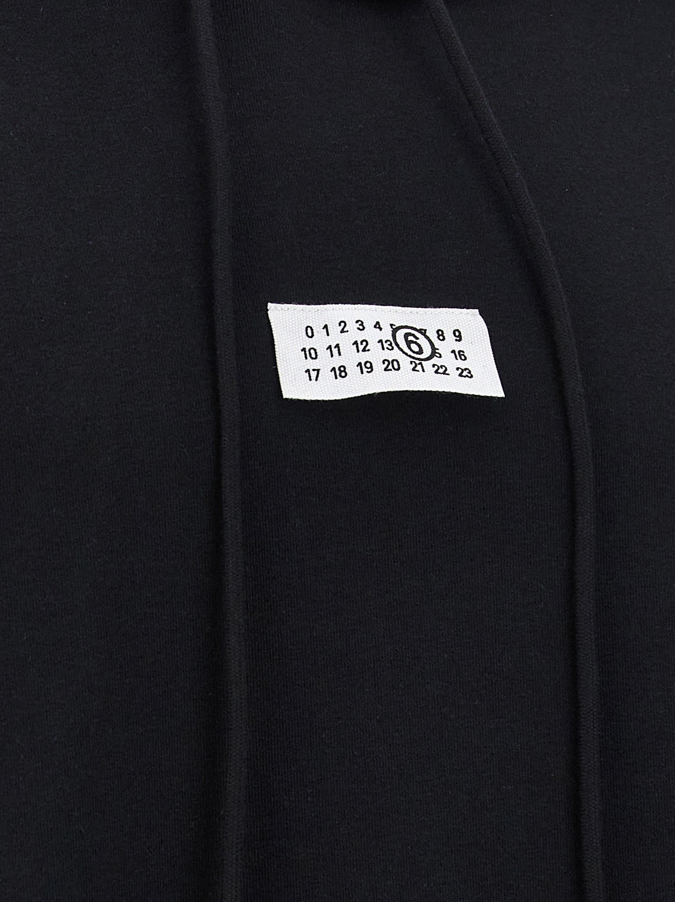 Brushed cotton hoodie with front 'Numeric signature MM6' patch, kangaroo pocket, long cuffed sleeves and dropped shoulders, and 'White stitch line' at the back.