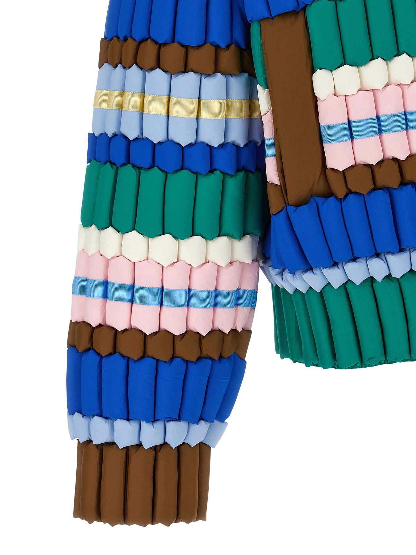 Nylon down jacket with 3D structure with goose down padding and grosgrain ribbon details, high color, front zip closure, pockets, long sleeves with cuffs and dropped shoulder, elastic at the hem.