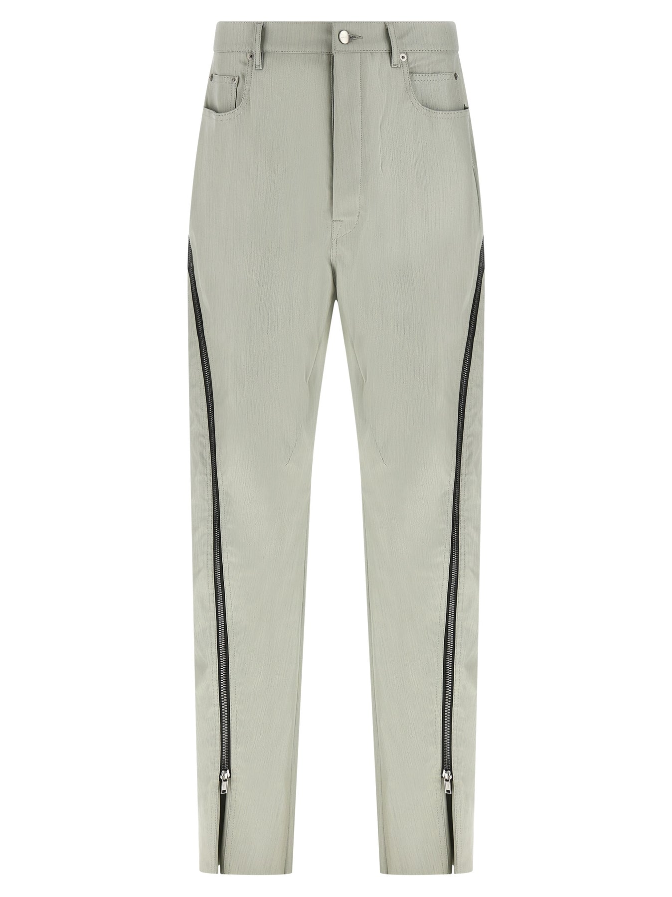 High-waisted cotton denim jeans Bolan Banana with semi-gloss coating, adjustable boot leg thanks to the zip, five pockets, button closure, raw cut on the leg bottom. The natural aspects of this fabric mean that the coating has come off in some areas exposing the underlying material that will continue to do so with wear and abrasion. This is an intrinsic feature of this type of treatment and is a desired visual aspect that adds to the uniqueness of each piece and should not be considered a defect.