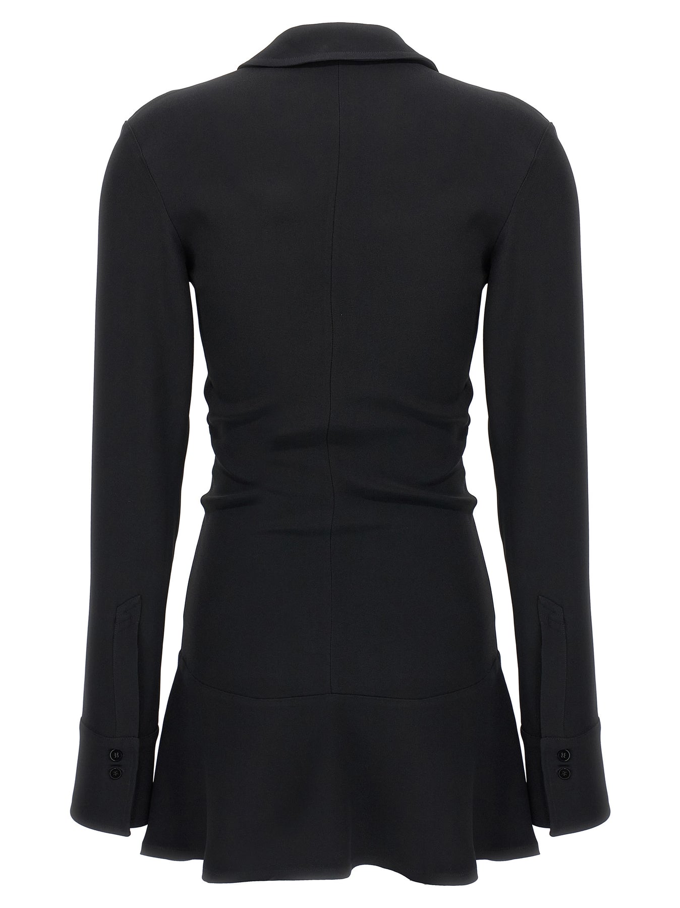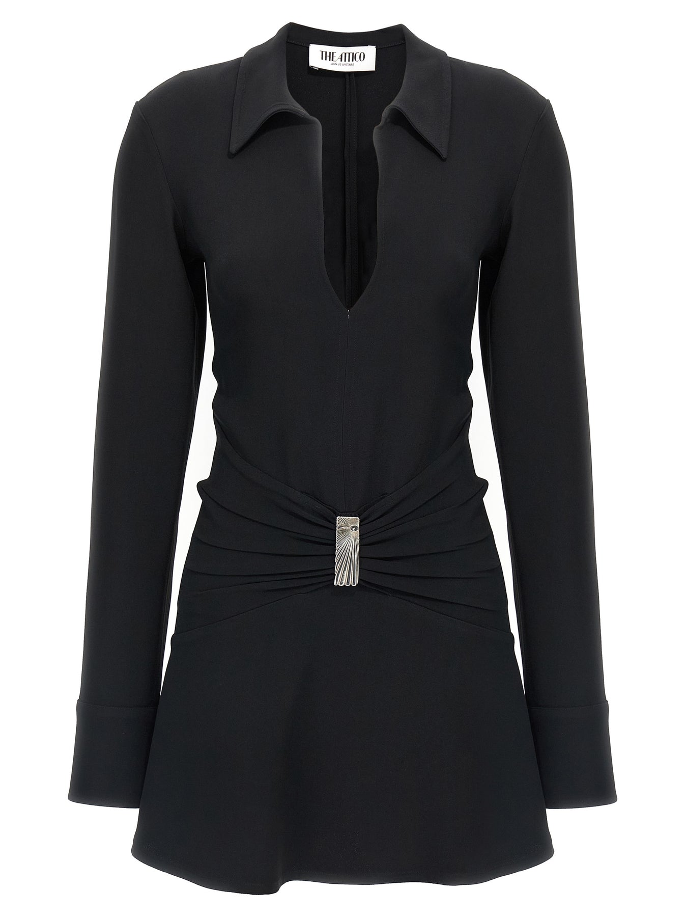 Cady polo shirt mini dress with V-neck and collar, front detail gathered at the waist, side zip closure, long cuffed sleeves.