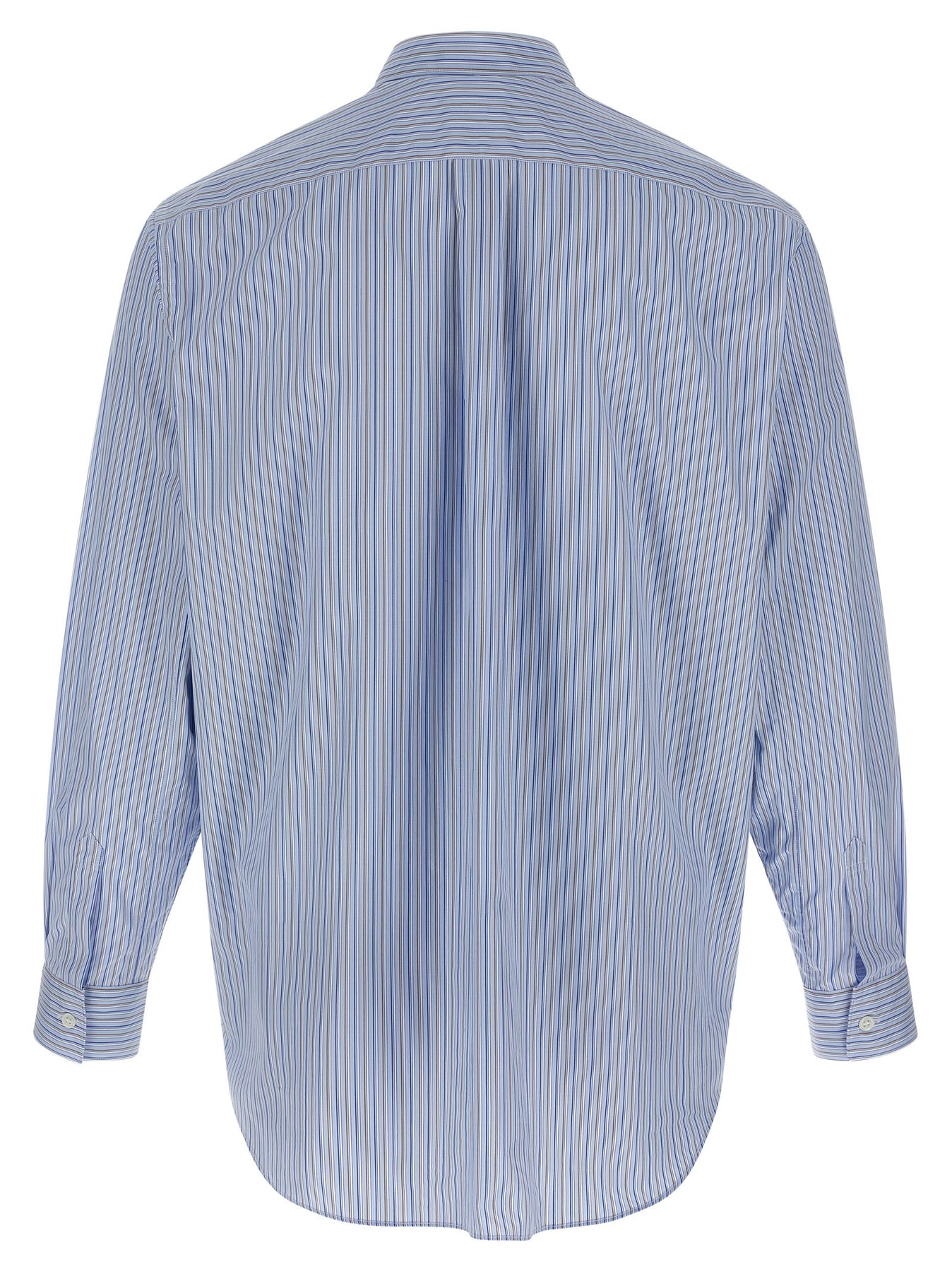 Striped cotton poplin shirt with patterned front inserts, button closure, breast pocket, long cuffed sleeves, and asymmetric hem.