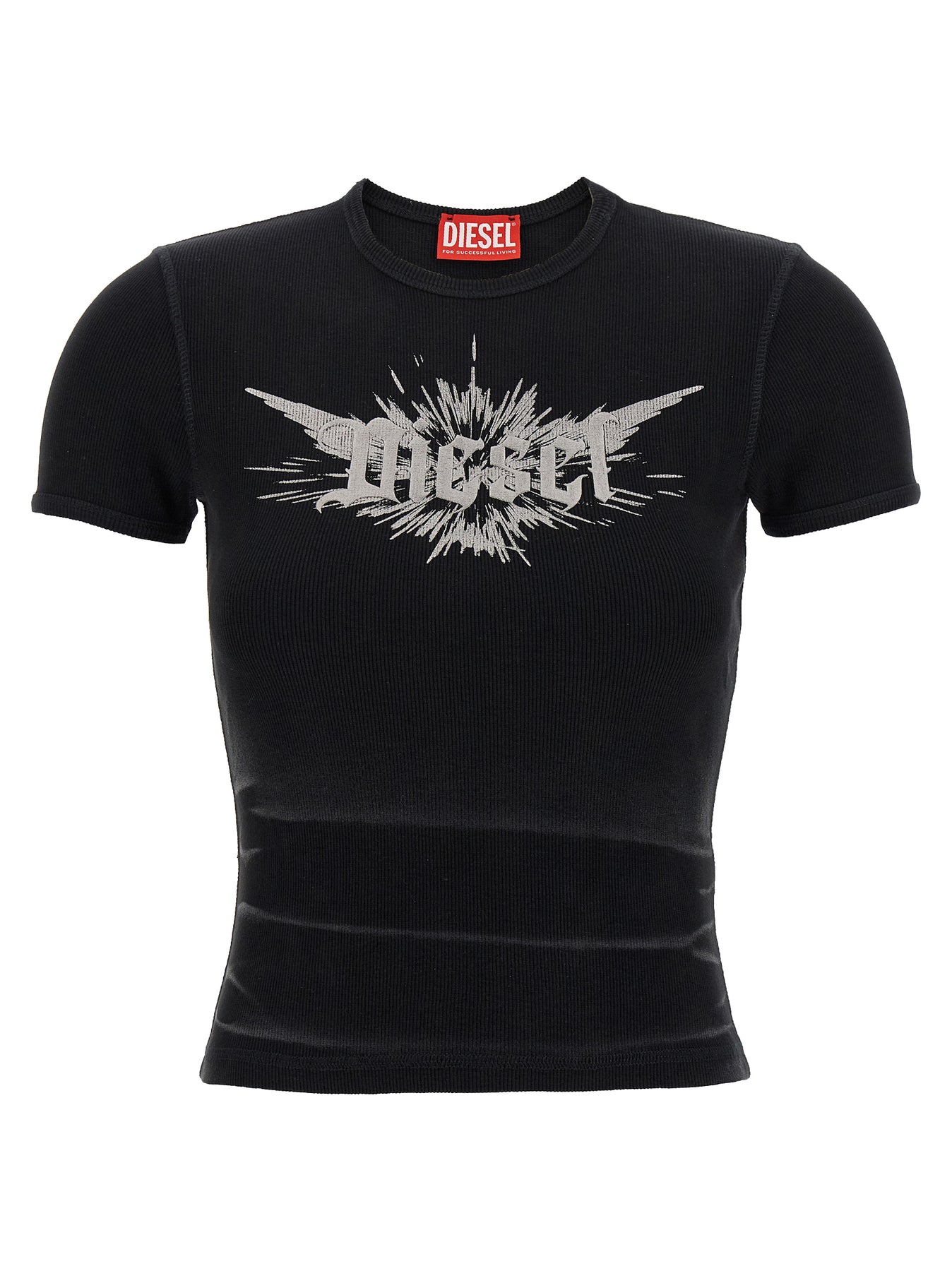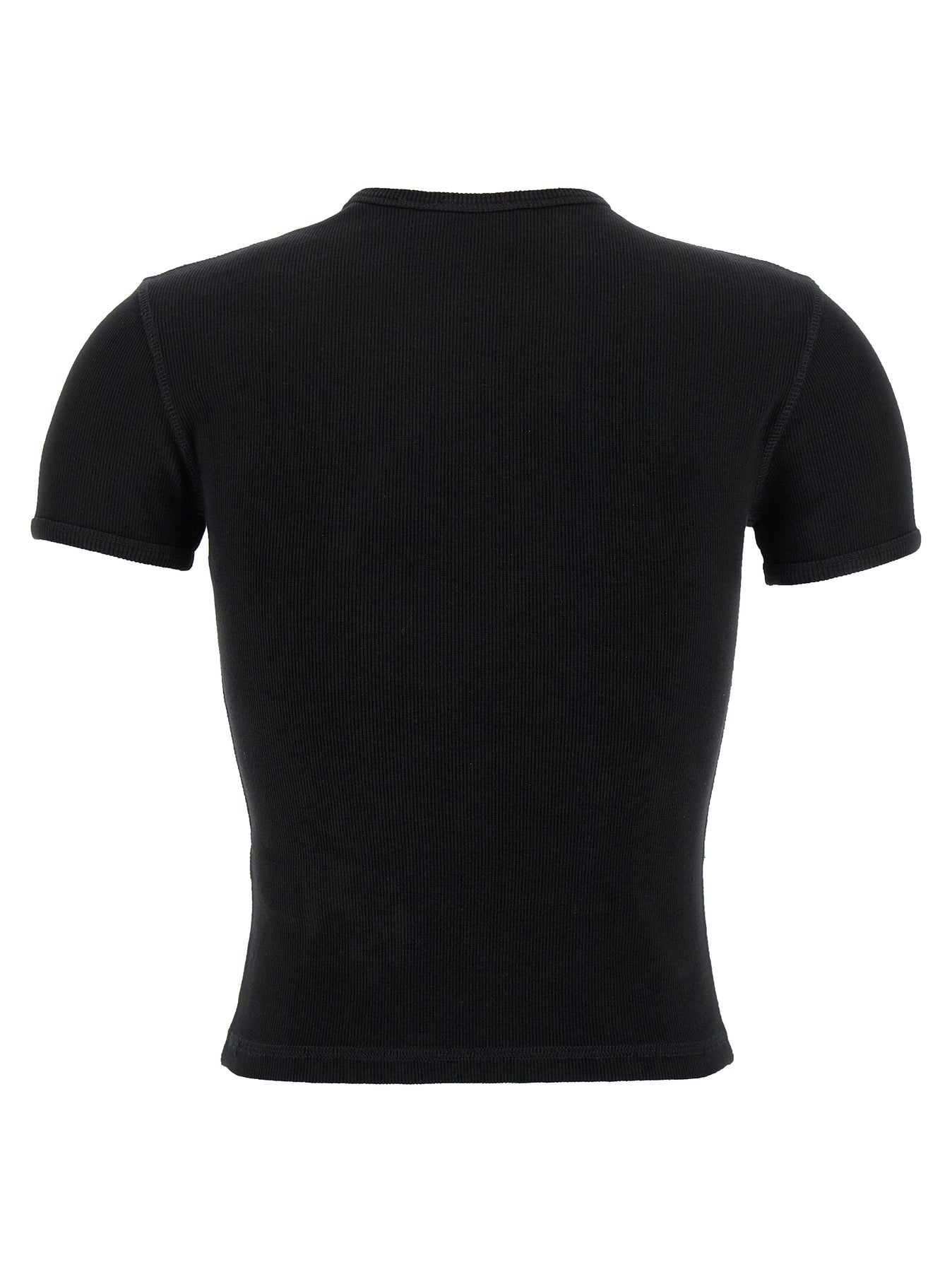 'T-Ele-Long-P2' ribbed stretch cotton jersey T-shirt with stonewashed treatment and front lasered whiskers, front laminated logo print, crew neck, short sleeves.