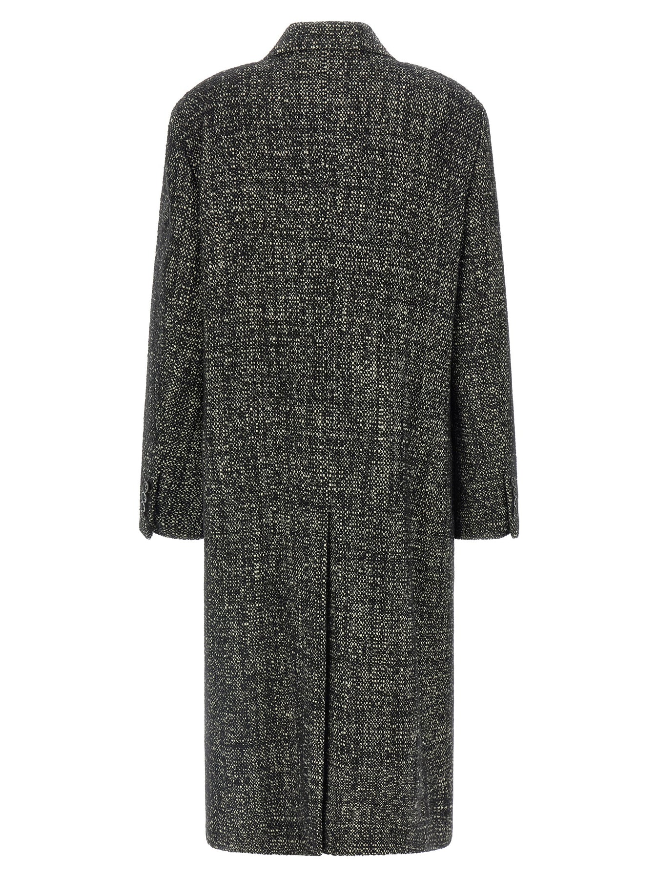 Two-breasted long coat in wool and cashmere bouclé with front button closure, lapel collar, breast pocket, flap pockets, structured shoulder strap, long sleeves, cuffs with open buttonholes, back split, viscose lining.