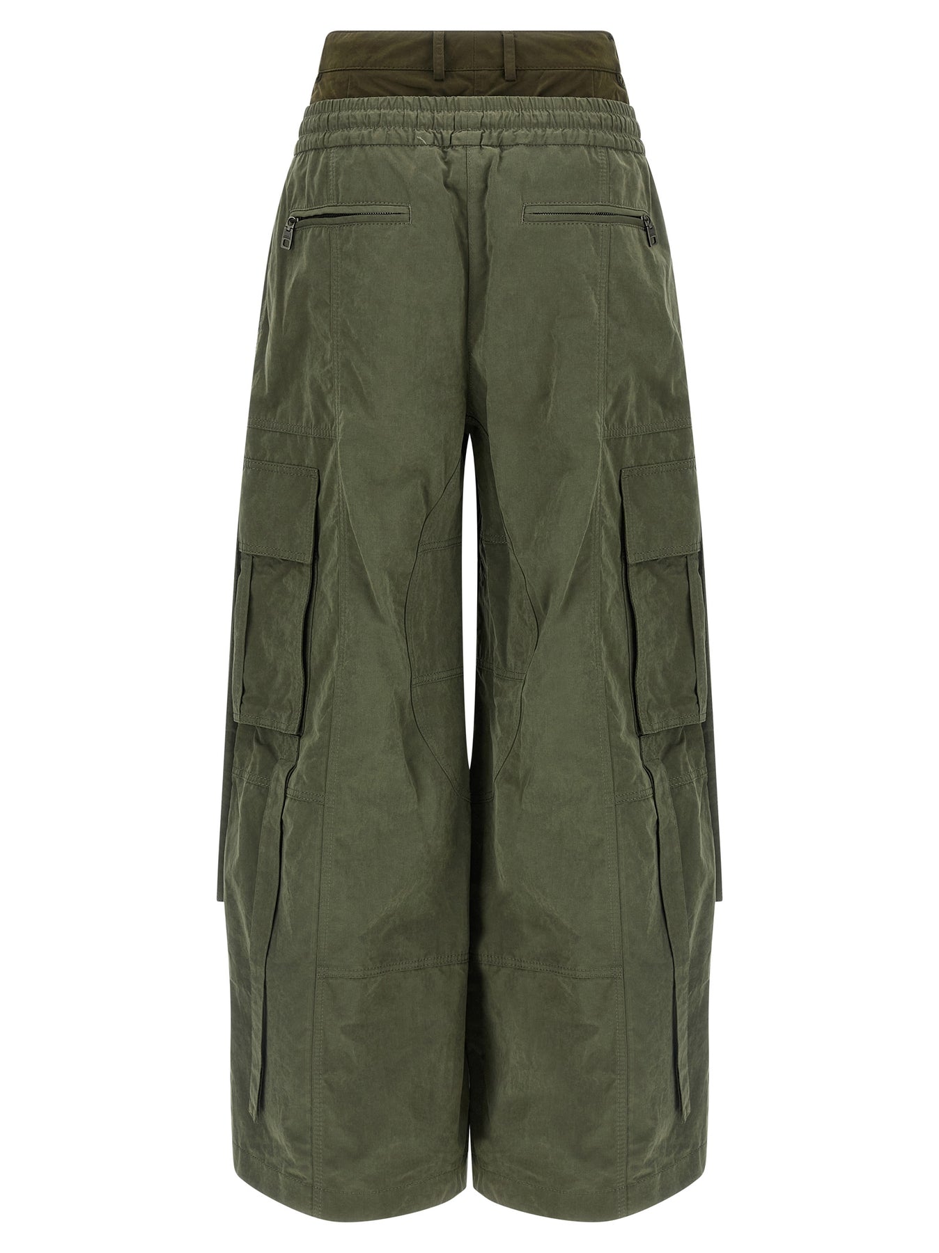 Waxed faille pants with washed and wrinkled effect, cargo model, Low waist with heavy cotton double layer detail with zip and front button closure, zip flap, adjustable drawstring elastic waistband, pockets, flared wide leg, tonal tapes..