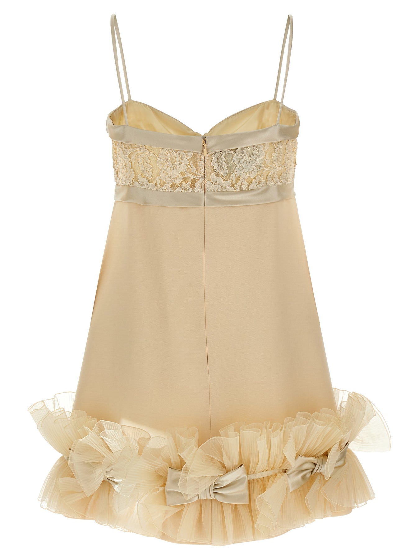Solid Crepe Couture mini dress with heart-shaped neckline with lace details and tone-on-tone satin bows, thin straps, sleeveless, pleated Taffetas ruffles and Satin Crepe bows, back zip closure, Habotai silk lining.