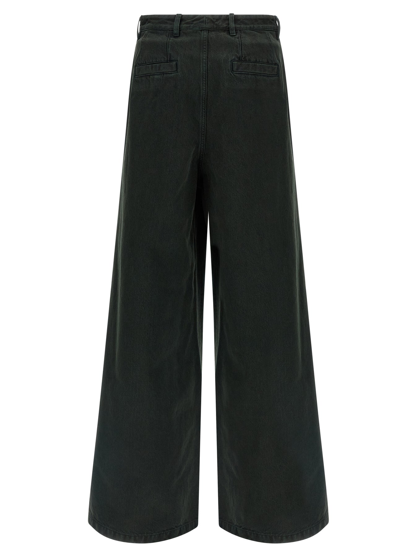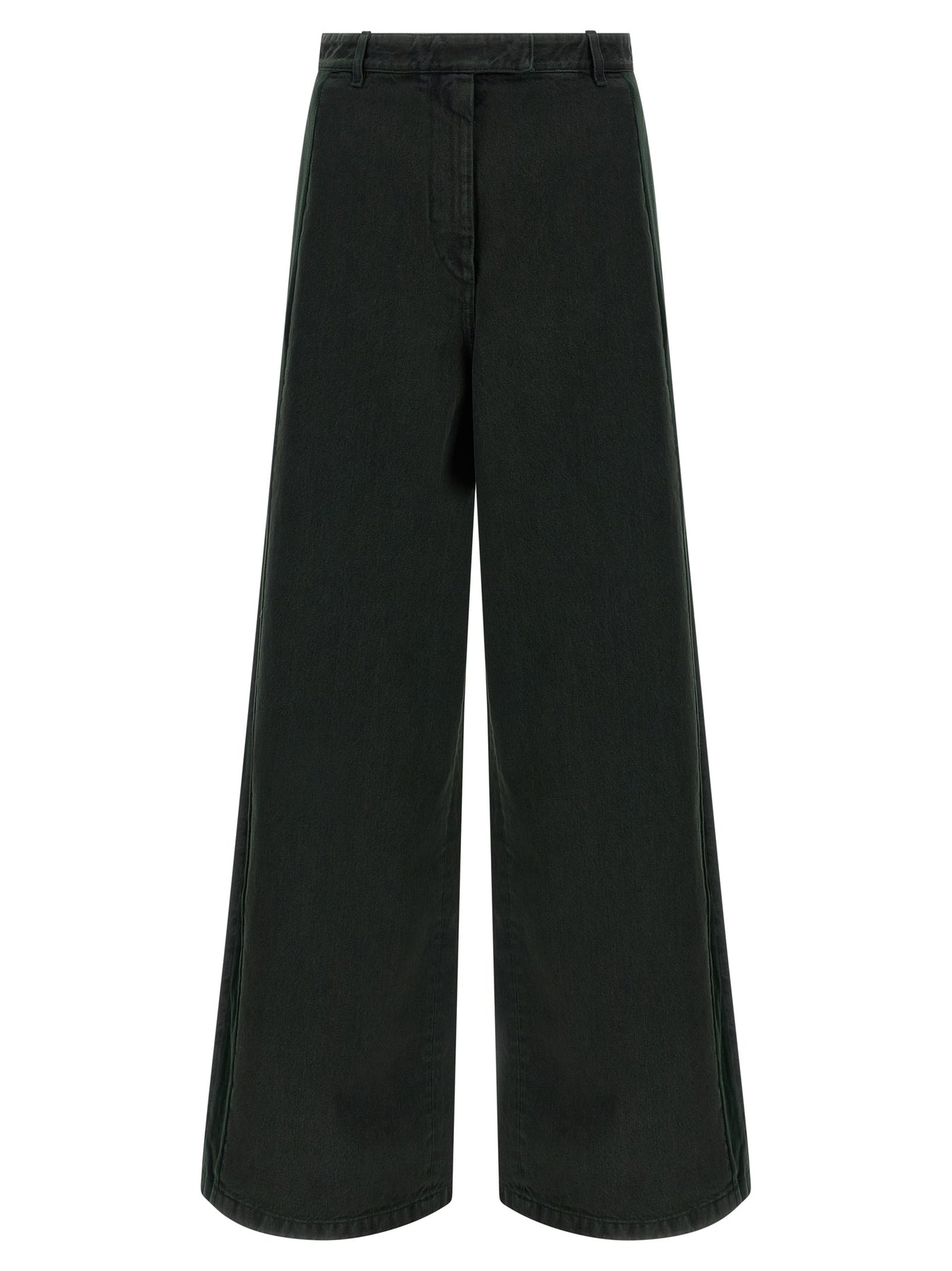 Garment-dyed cotton denim jeans with tone-on-tone velvet side insert, mid waist, wide and straight leg, zip, hook and front button closure, pockets.