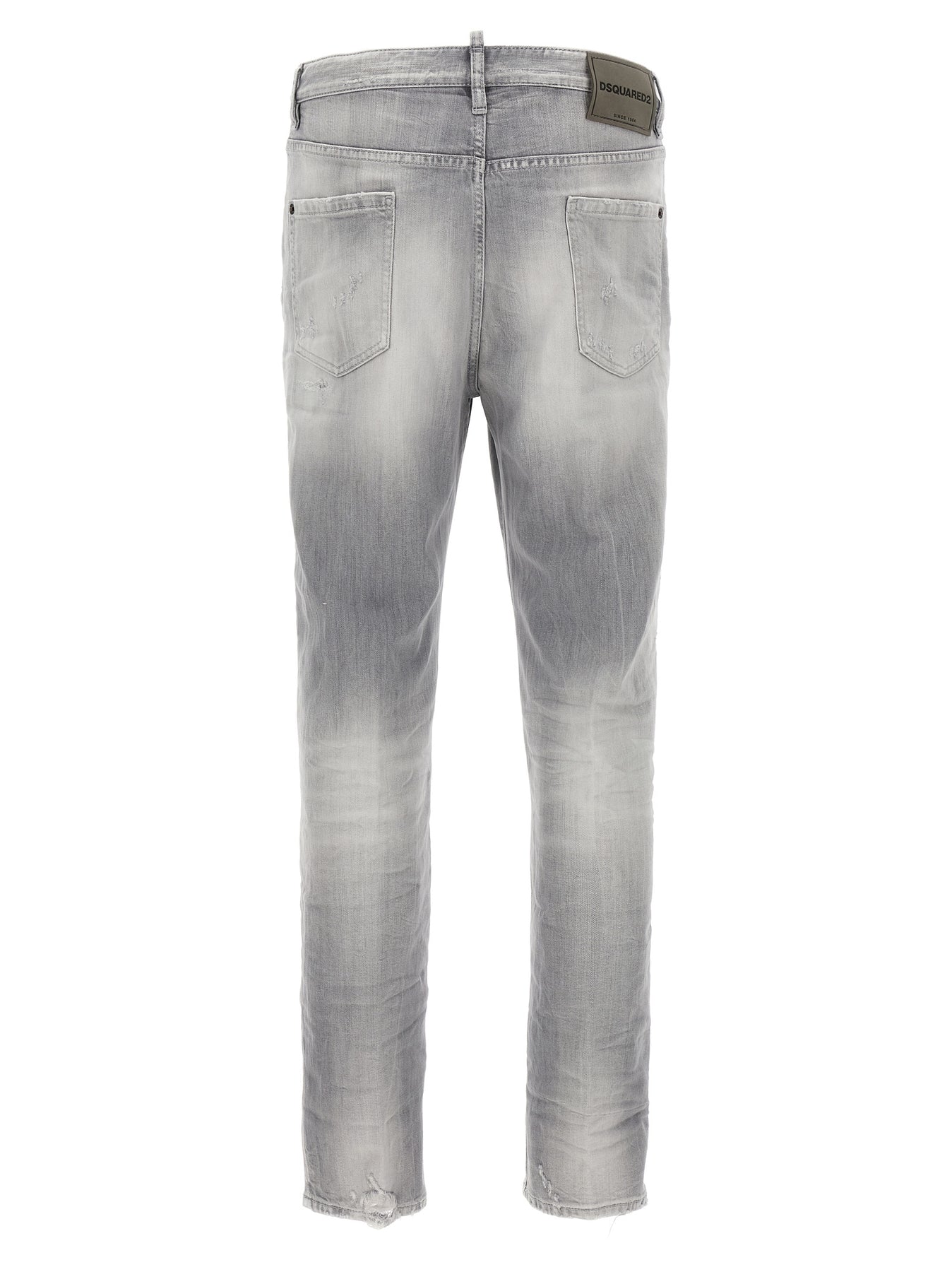 '642' cotton denim jeans with used-effect details, button closure, five pockets, maxi leather logo tag.