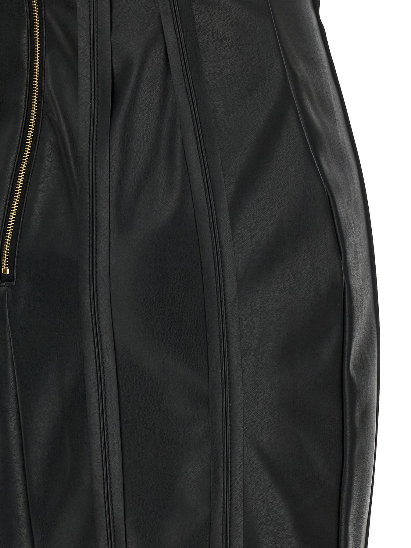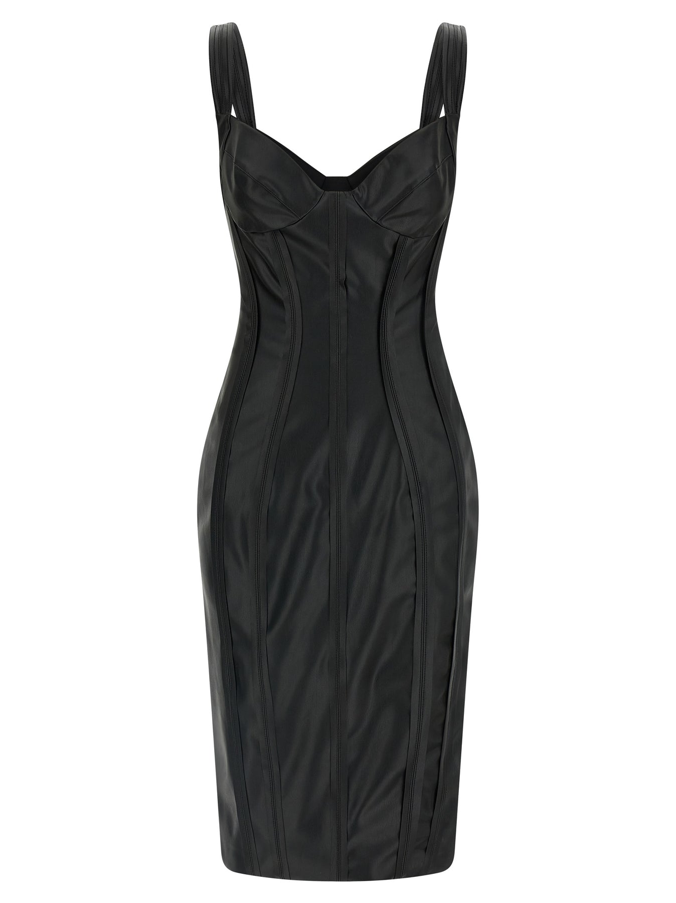 Nappa effect fabric midi dress, bustier construction with pre-shaped cups, sweetheart neckline, sleeveless, zip closure and back split, knit lining.