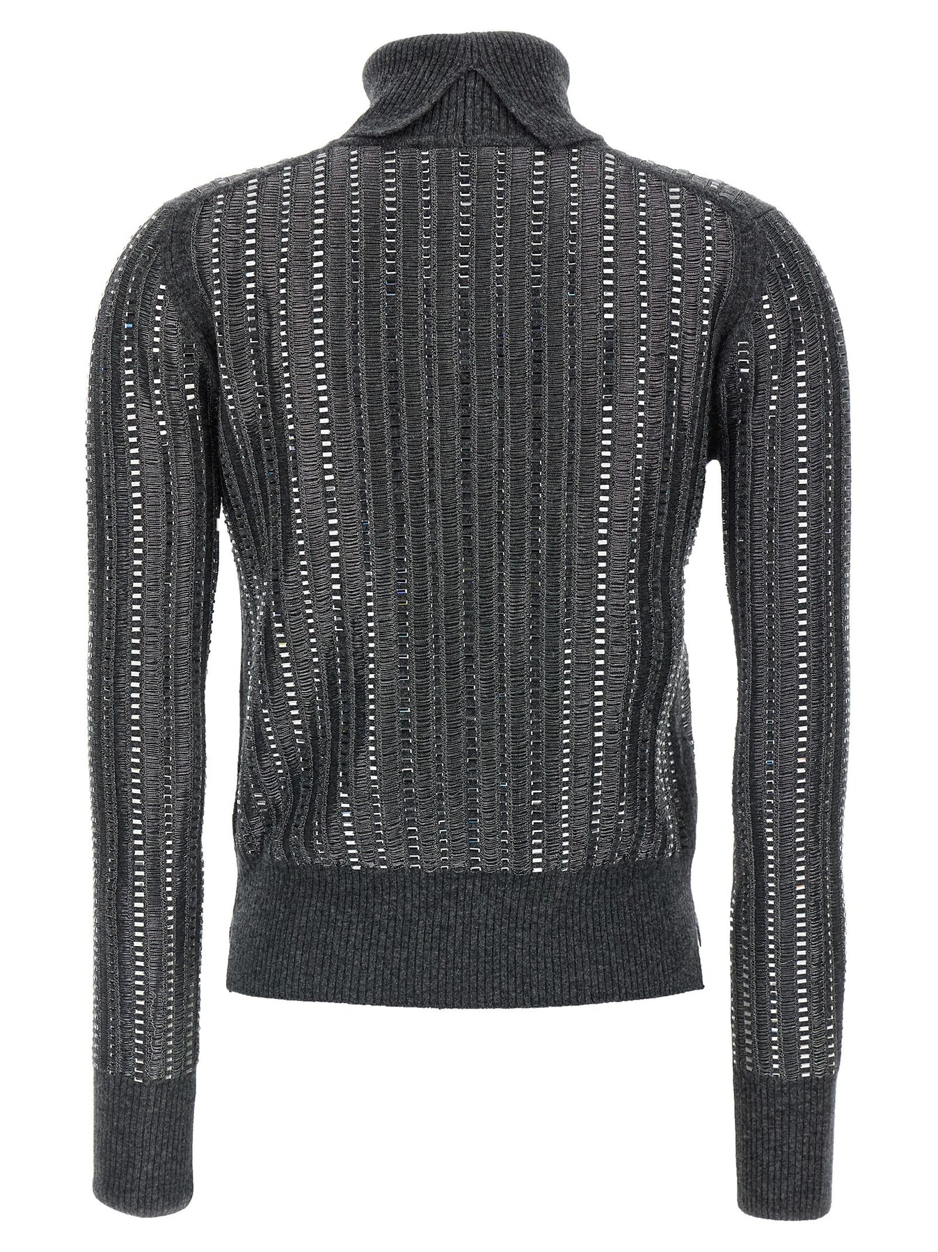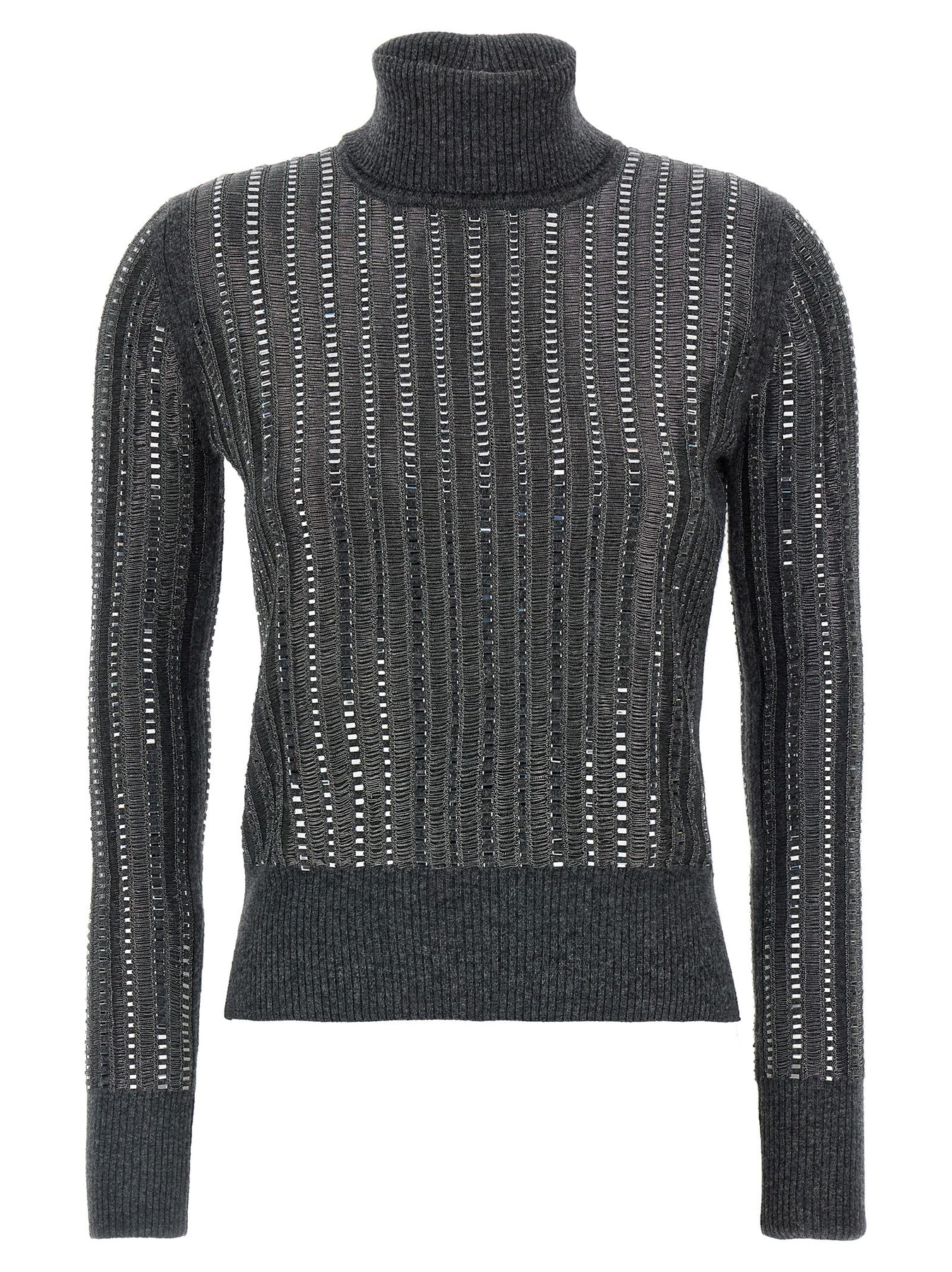 Wool and cashmere blend sweater with lurex thread and all-over crystal appliqué, high neck, long cuffed sleeves, side slits.