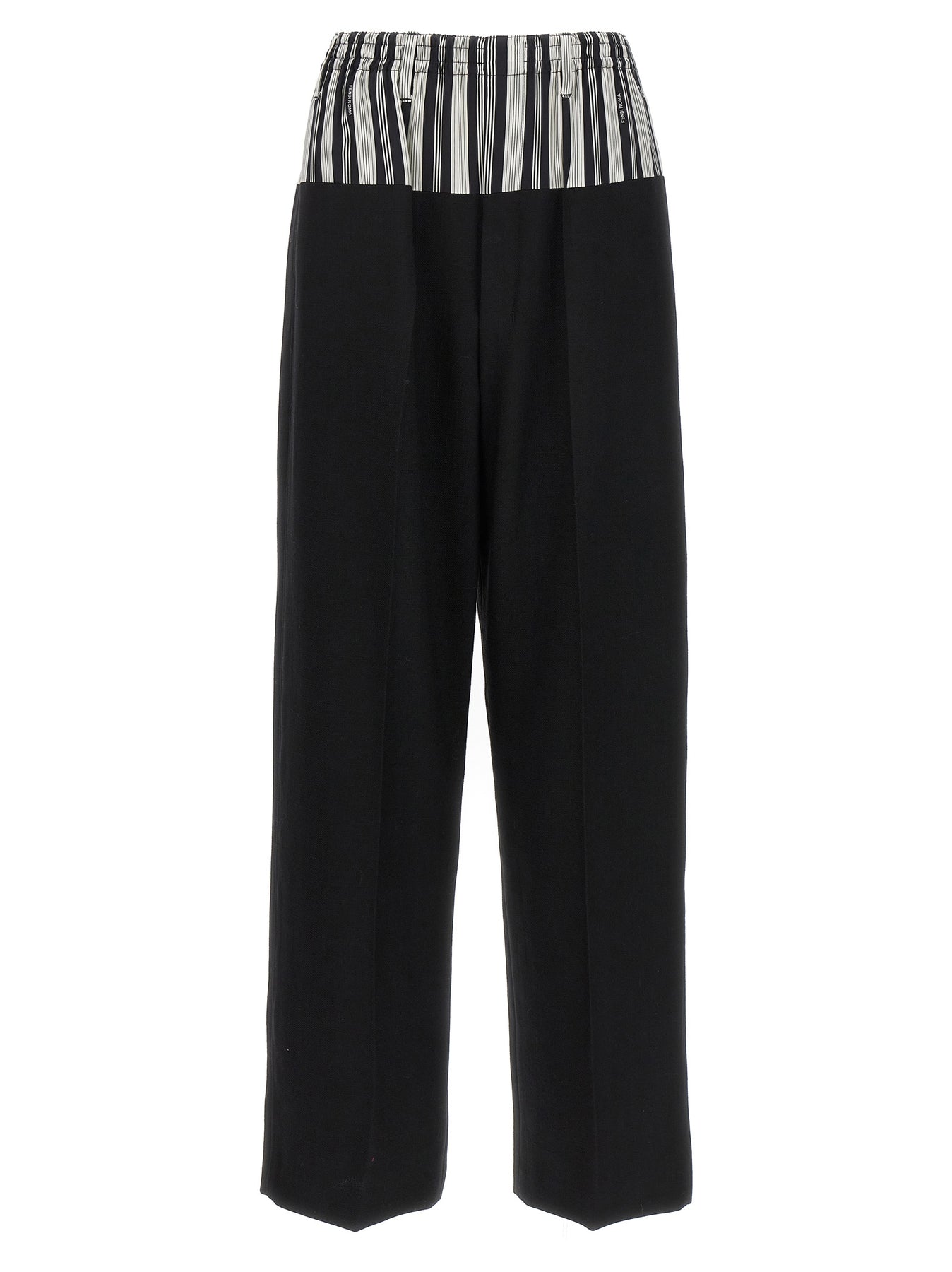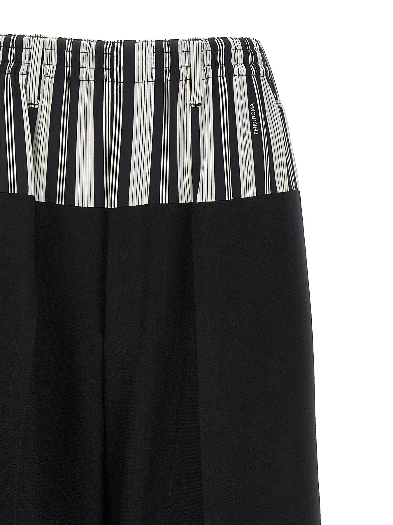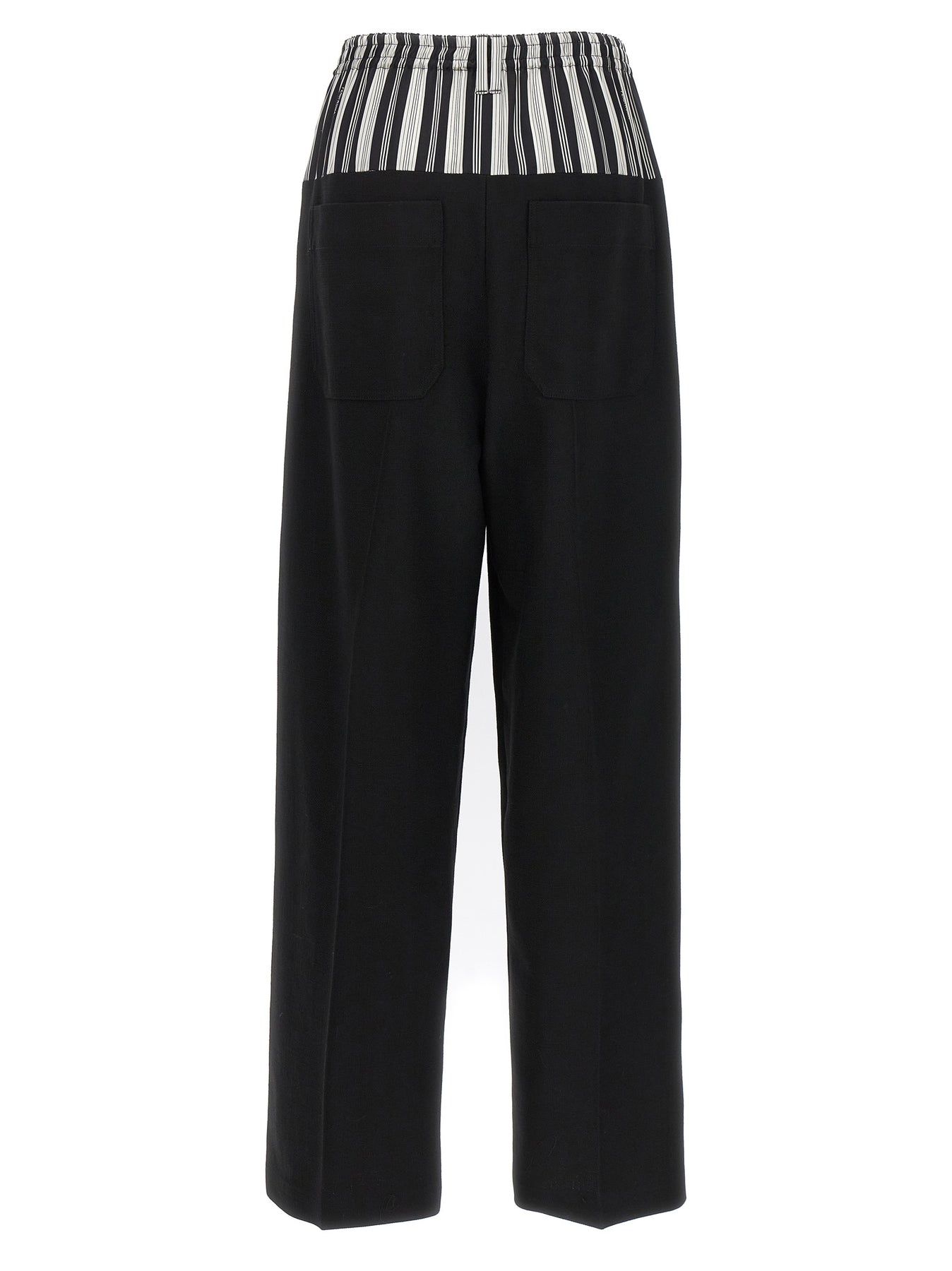 Cigarette-style wool pants with central pleated leg, trompe l'oeil satin effect waist with striped pattern and elastic.