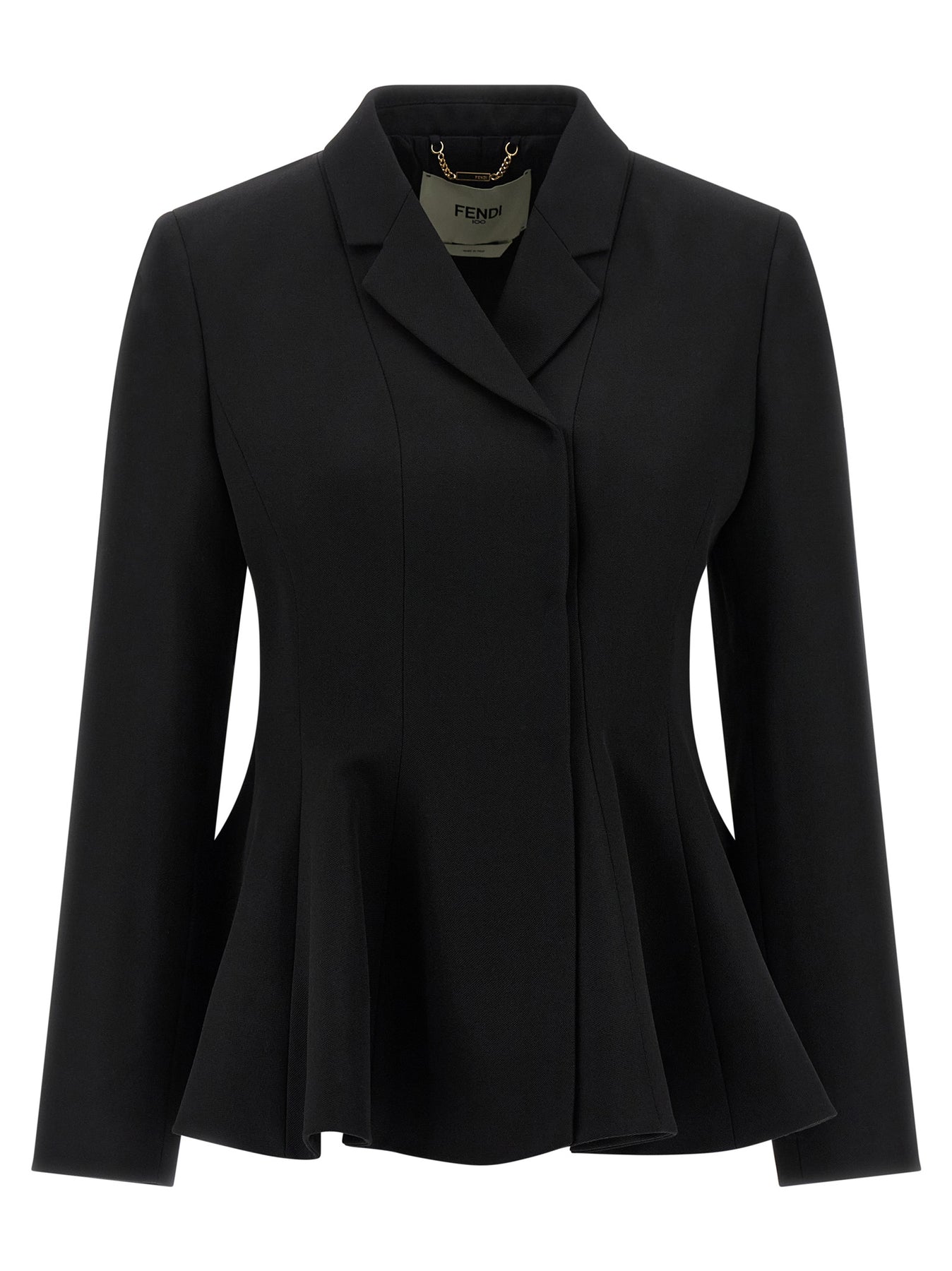 'Grain de Poudre' wool blazer jacket with V-neck with peak lapels, front hook closure, tight waist and wheel length, long sleeves.
