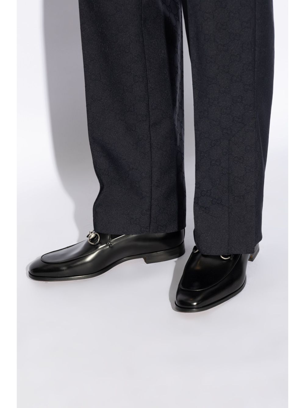 black calf leather brushed effect signature Horsebit detail almond toe slip-on style branded leather insole flat leather sole
