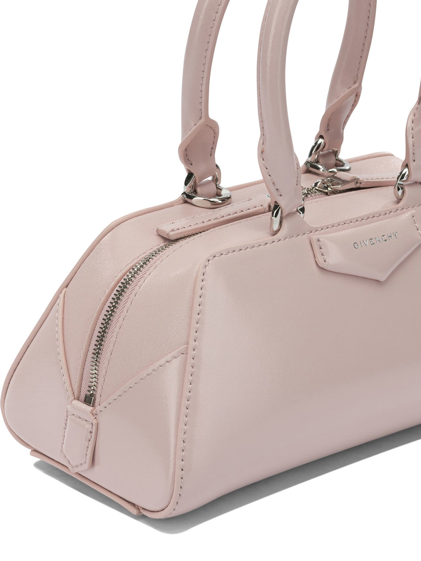 Givenchy small "Antigonia East-West" handbag in Box calfskin and shiny grain leather. Rigid frame with elongated silhouette and origami-style gusseted structure. Zipper top closure. Articulated leather handles with four D-rings for attaching shoulder strap. Adjustable and removable leather shoulder strap included. Pentagonal Givenchy signature embossed applique on front. || - Box calfskin and polished grain leather - East-West structure with side gussets - Top zipper closure - Articulated handles with four D-rings - Metallic details with silver finish - Pentagonal Givenchy signature embossed applique at front - Givenchy Paris signature on the inside - One main compartment - Adjustable shoulder strap length from 52 cm to 59 cm