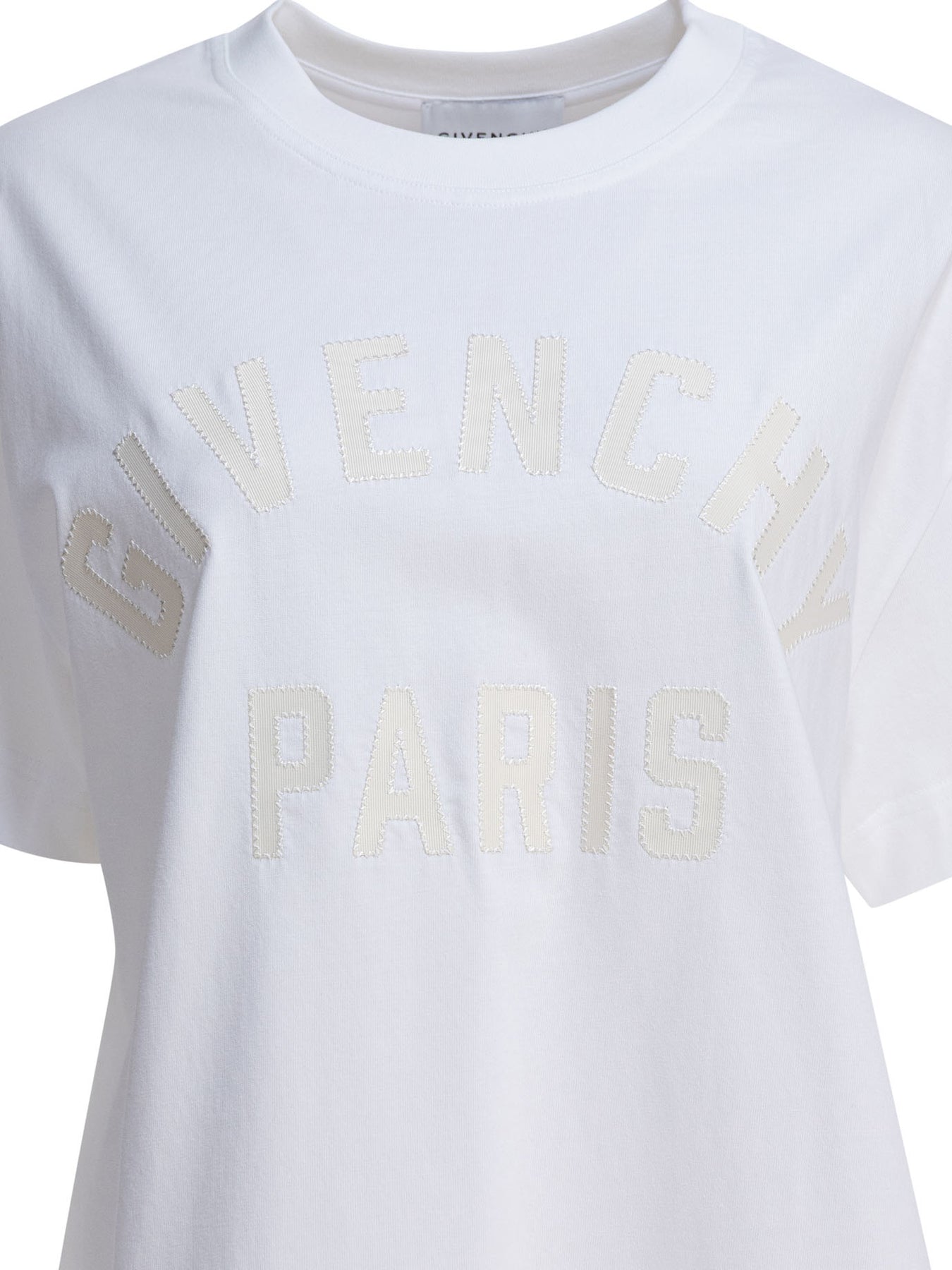 The GIVENCHY Paris logo T-shirt represents a sophisticated balance between comfort and contemporary style. Made for the woman who appreciates timeless fashion, this T-shirt stands out for its clean lines and versatility, perfect for any occasion. This essential garment offers a refined look, blending iconic details from the house with a modern, relaxed sensibility. Its high-quality cotton construction and attention to detail make it an excellent option for those seeking stylish and functional clothing. || - GIVENCHY Paris logo at front - Short sleeves - Oversized fit - Crew neck - Embroidered zig-zag stitching - Eco-friendly product
