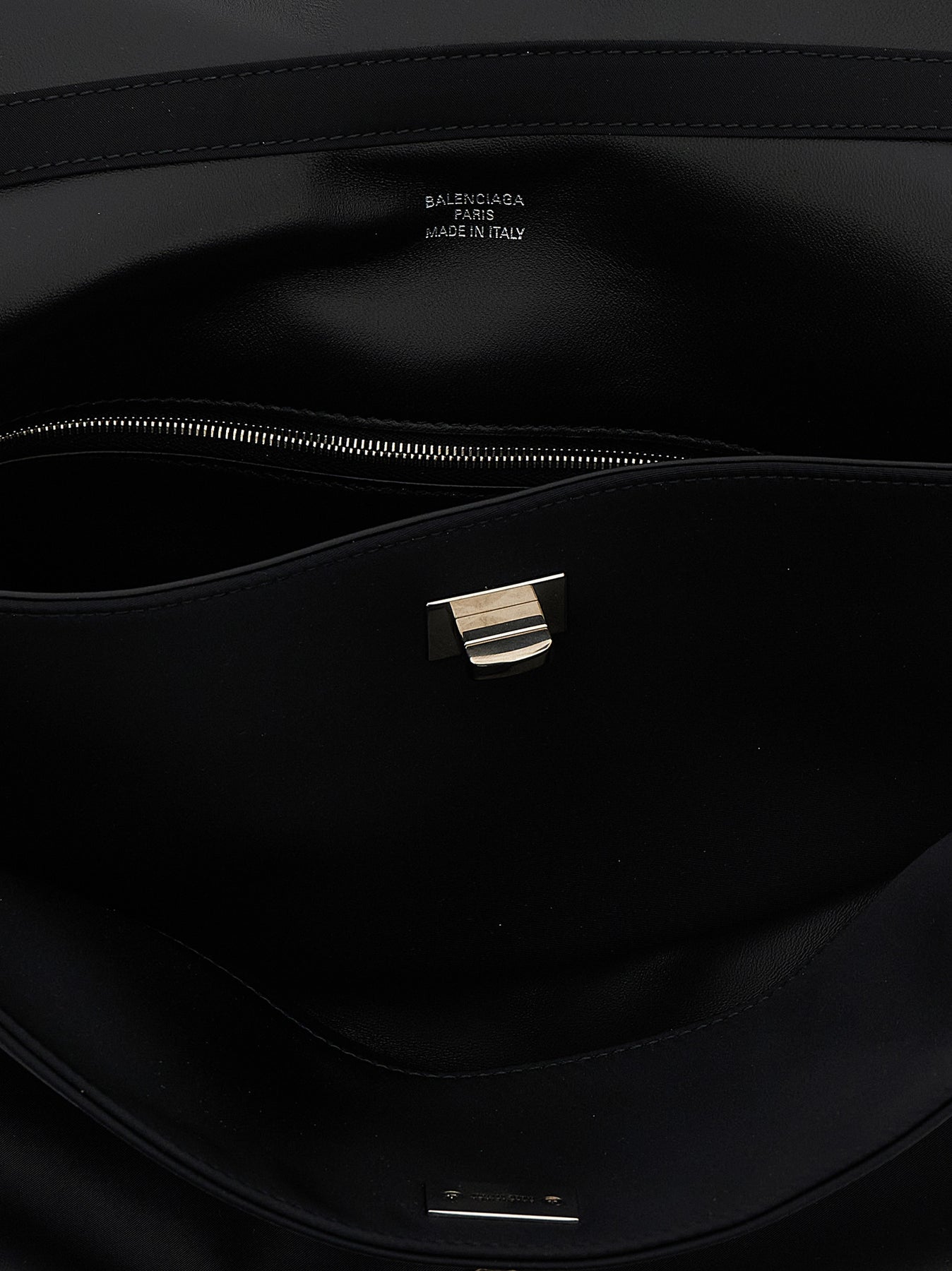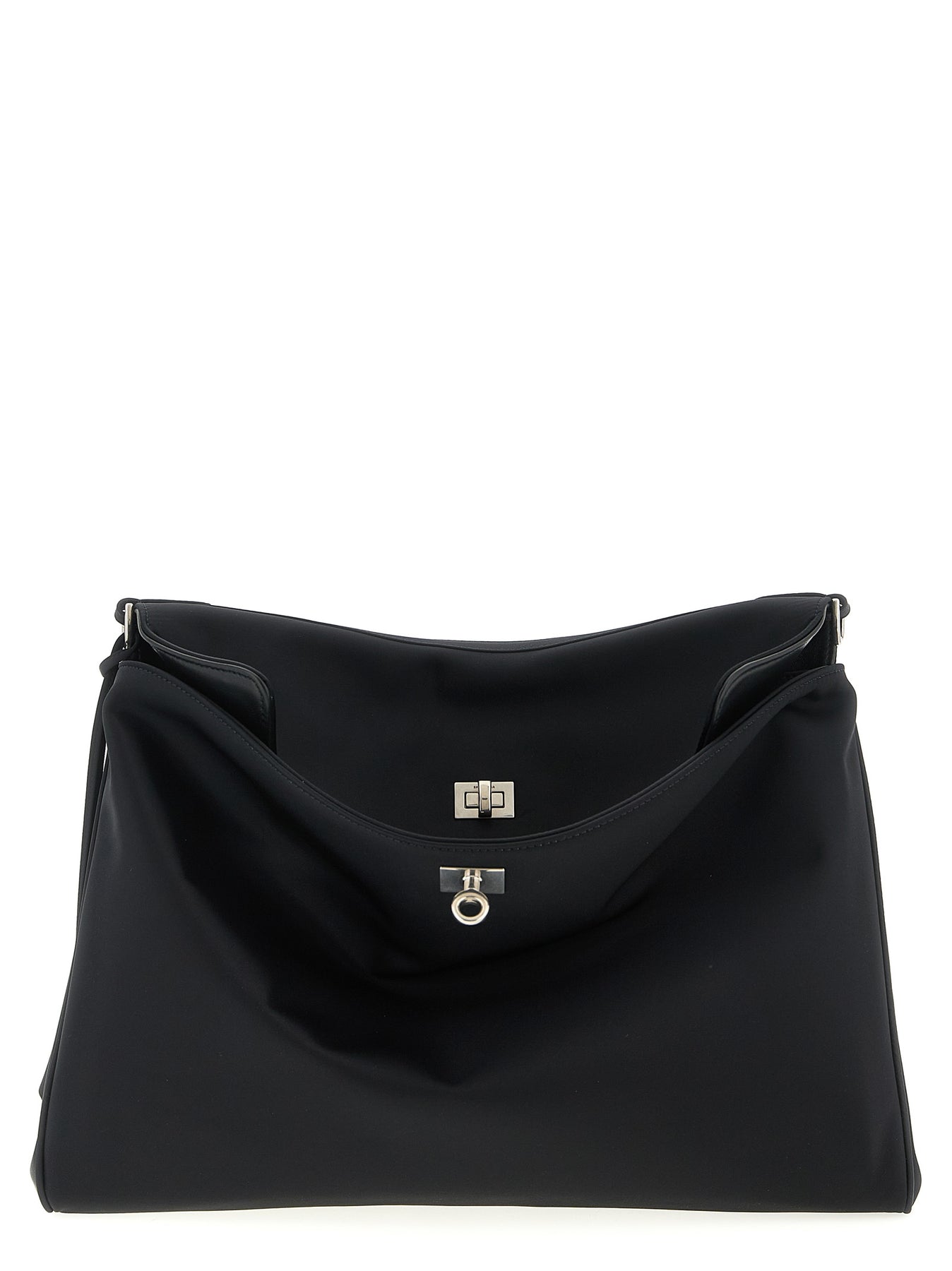 Medium 'Rodeo' handbag in nylon-effect fabric, leather interior and trim, removable ring tag, two compartments with metal turn lock, interior zip pocket, two rear pockets, side gussets with snap buttons, rigid bottom with brass feet, and removable shoulder strap.