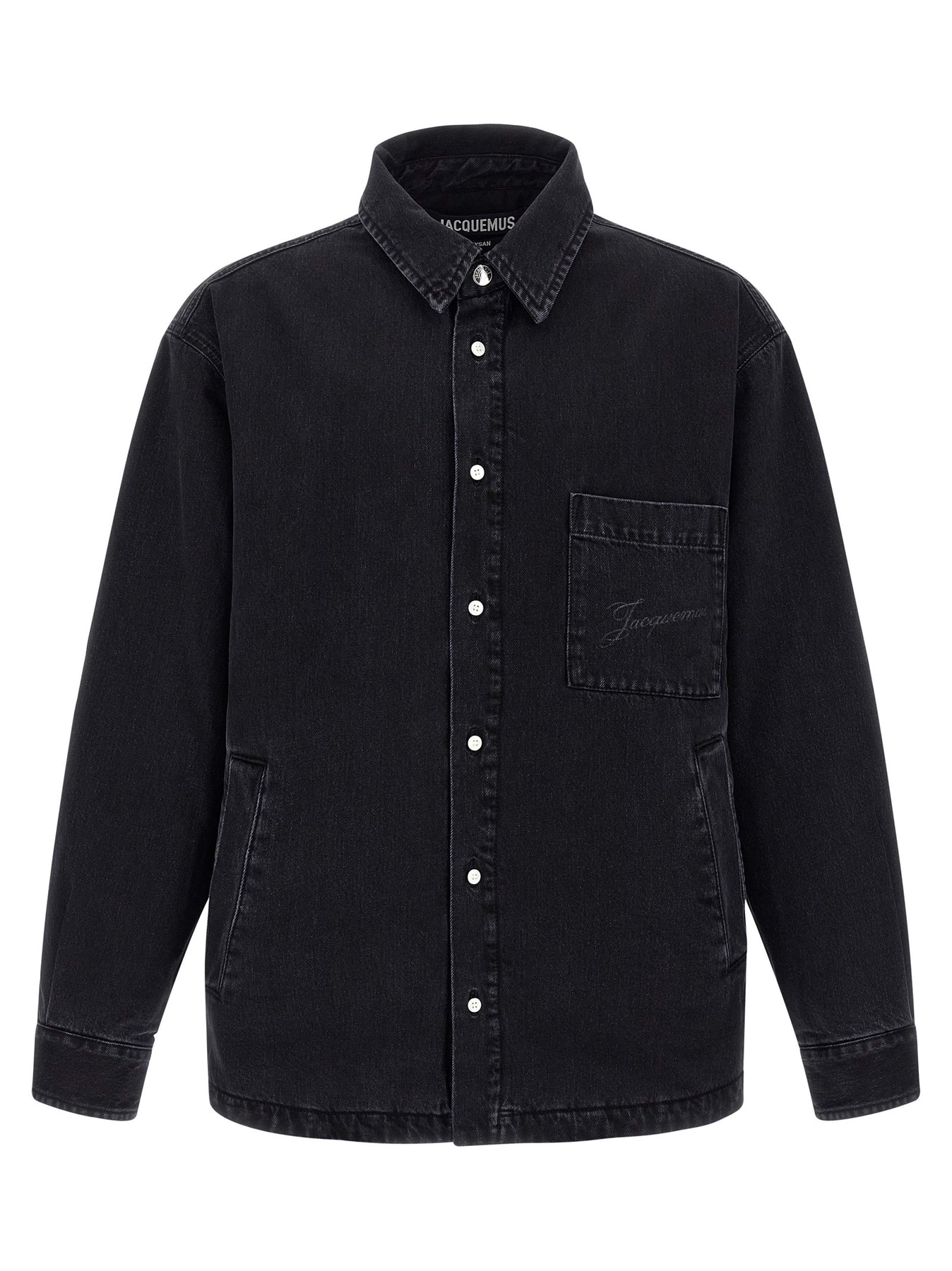 'La Chemise Boulanger' overshirt in washed cotton denim padded and lined, laser logo print pocket, front button closure, pockets, long sleeves with cuffs and dropped shoulder, side slits.