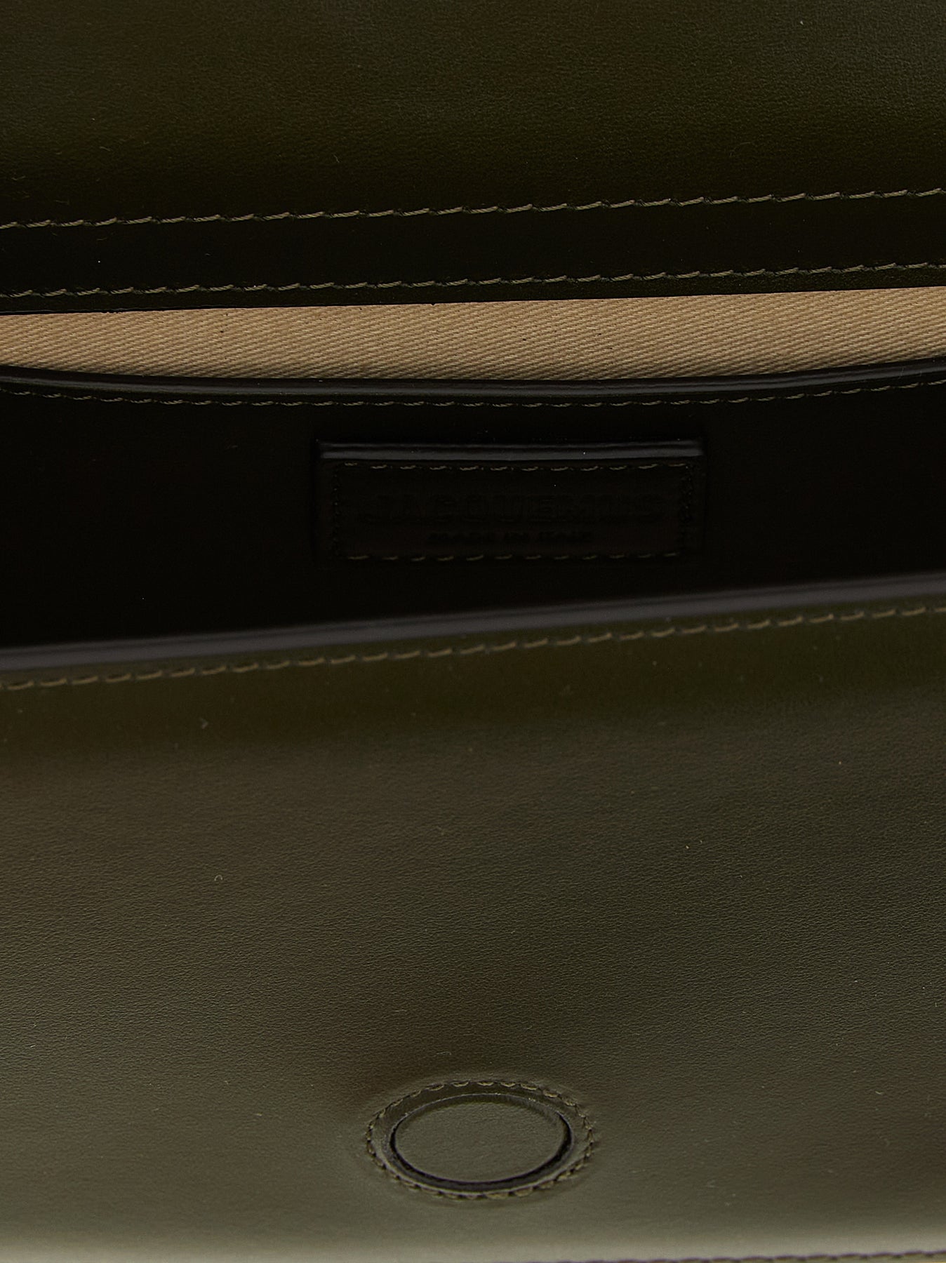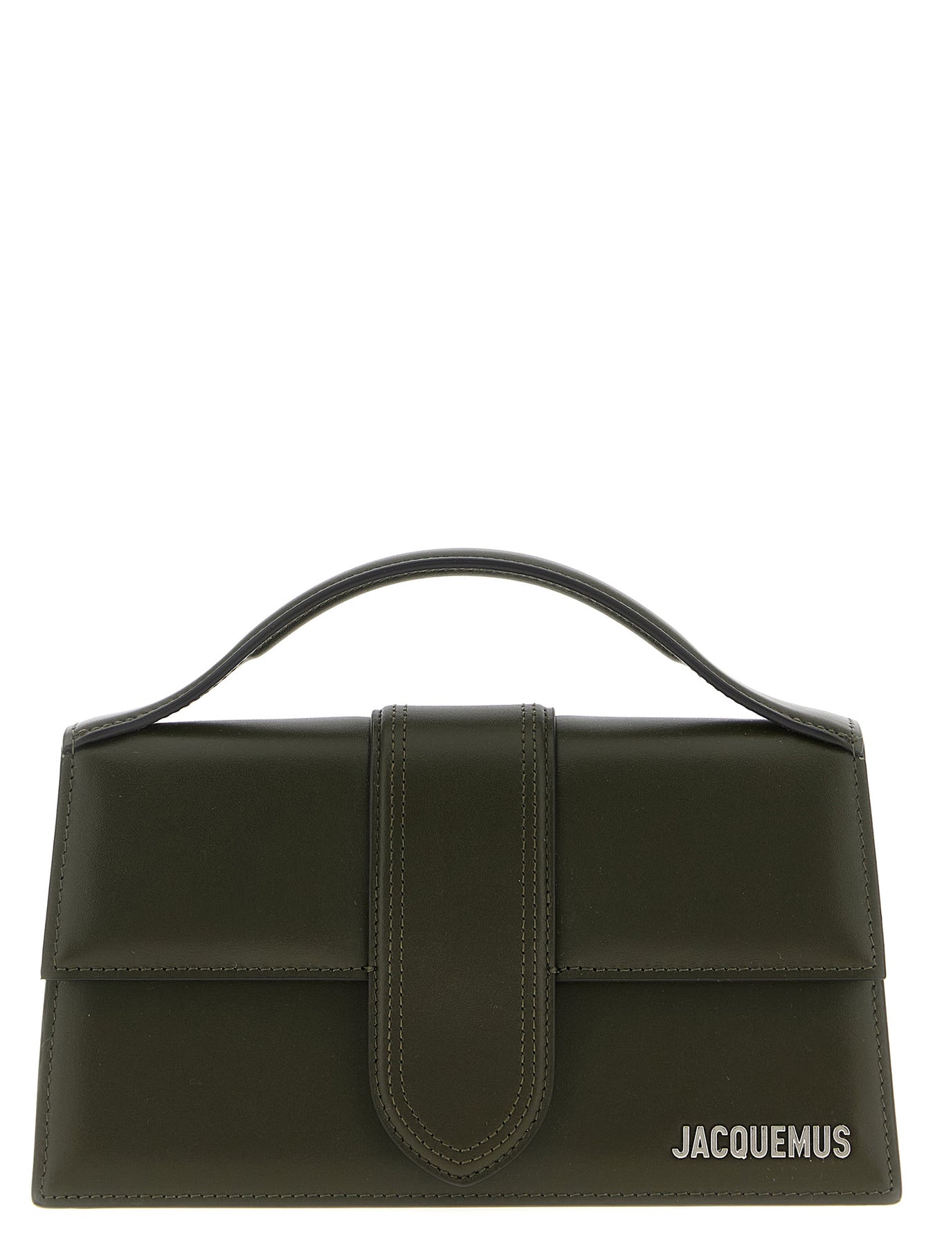 'Le Grand Bambino' leather handbag with magnetic flap closure, front metal logo appliqué, fixed handle, adjustable and removable shoulder strap.