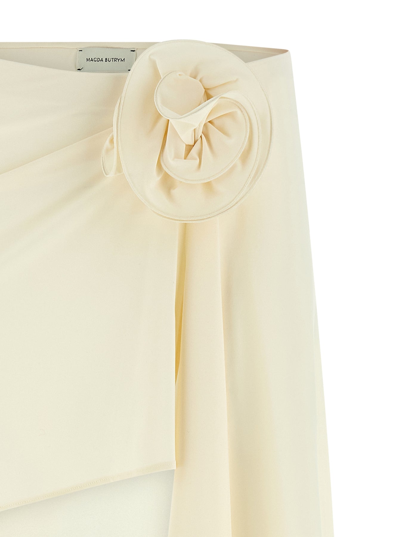 Draped stretch fabric '01' skirt with side maxi flower applique, asymmetrical pattern with side slit and sash, elastic waistband.
