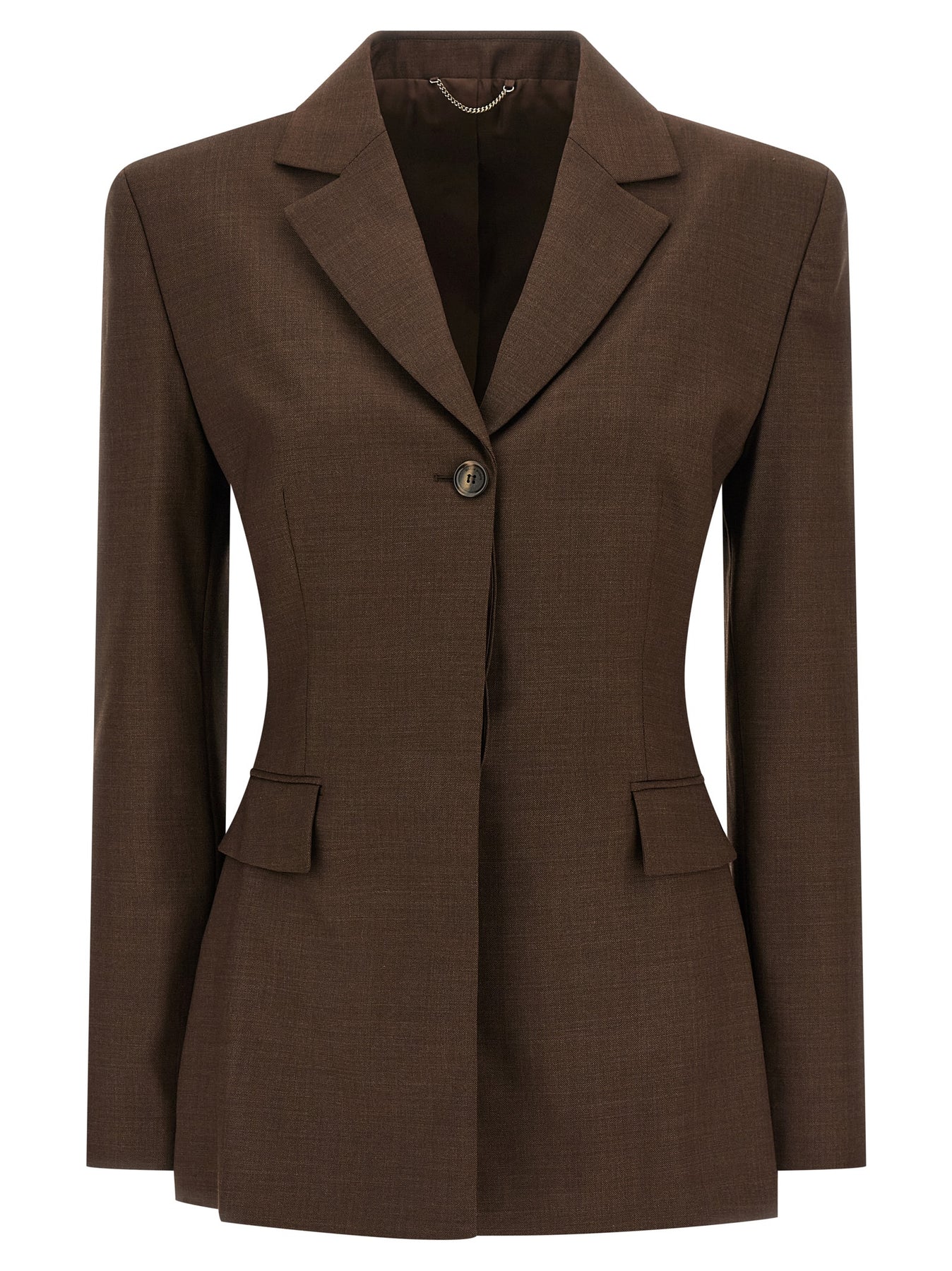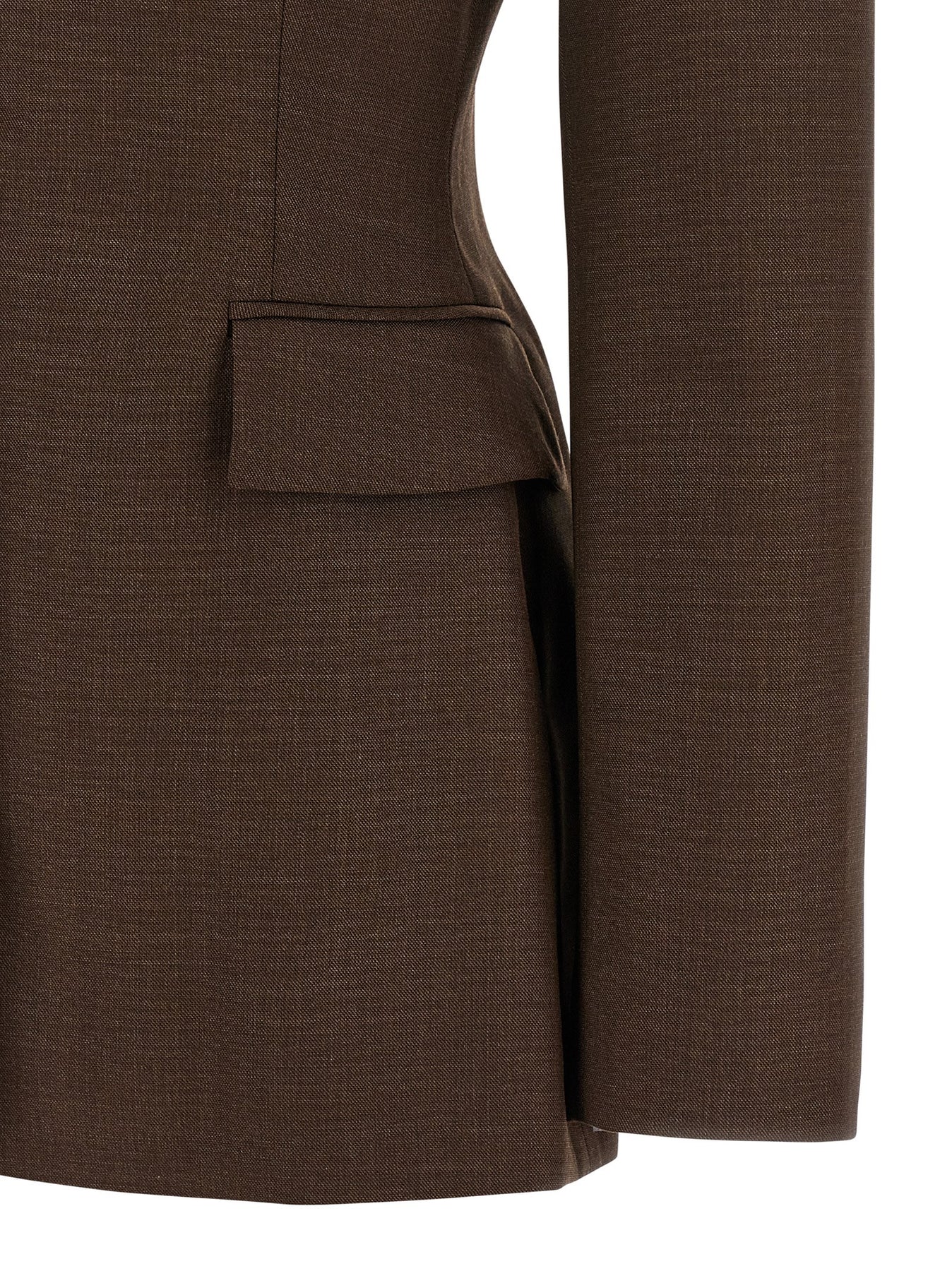 '03' single-breasted wool blazer with hourglass silhouette with front button closure, mirror lapels, flap pockets, padded shoulder, long sleeves, silk lining.