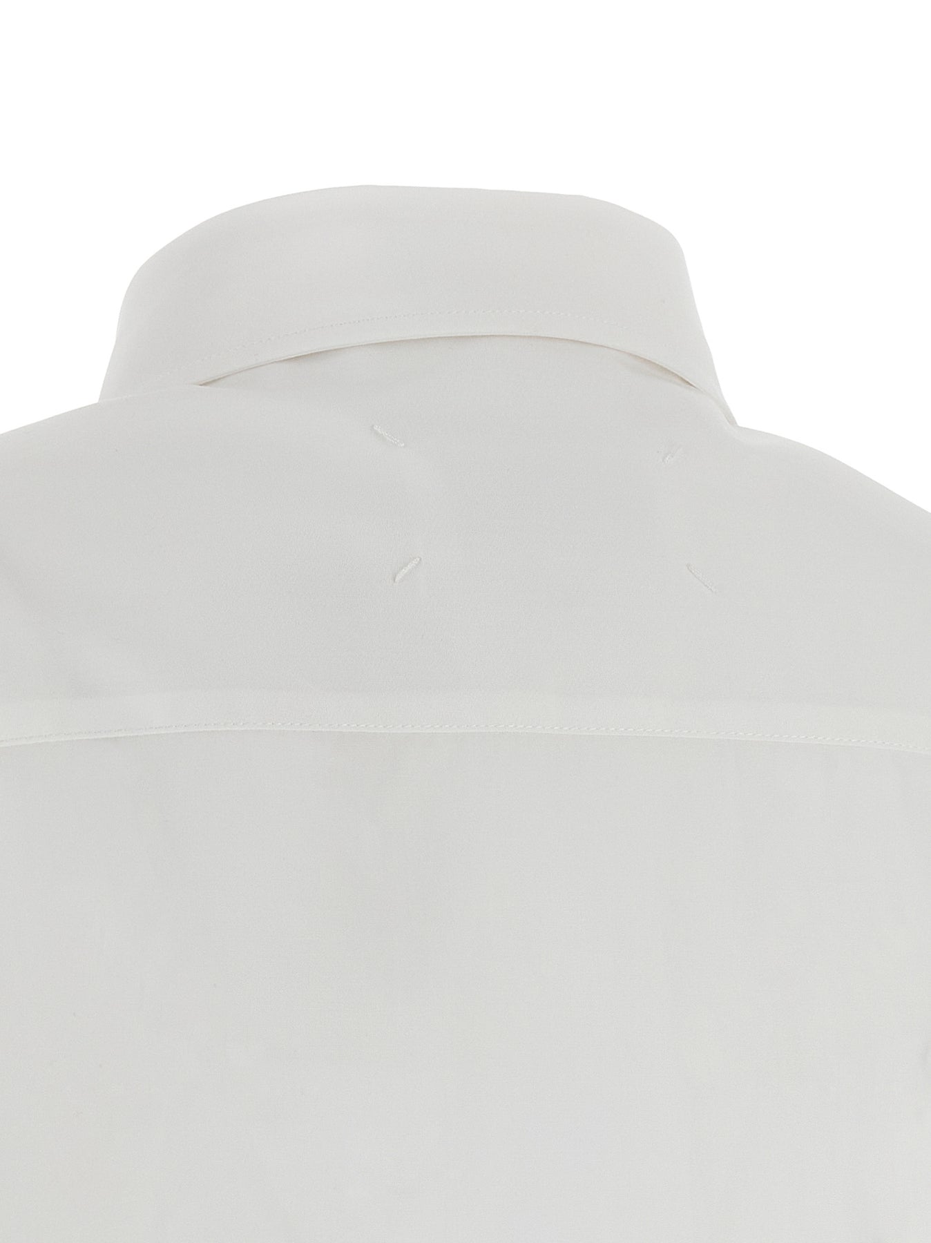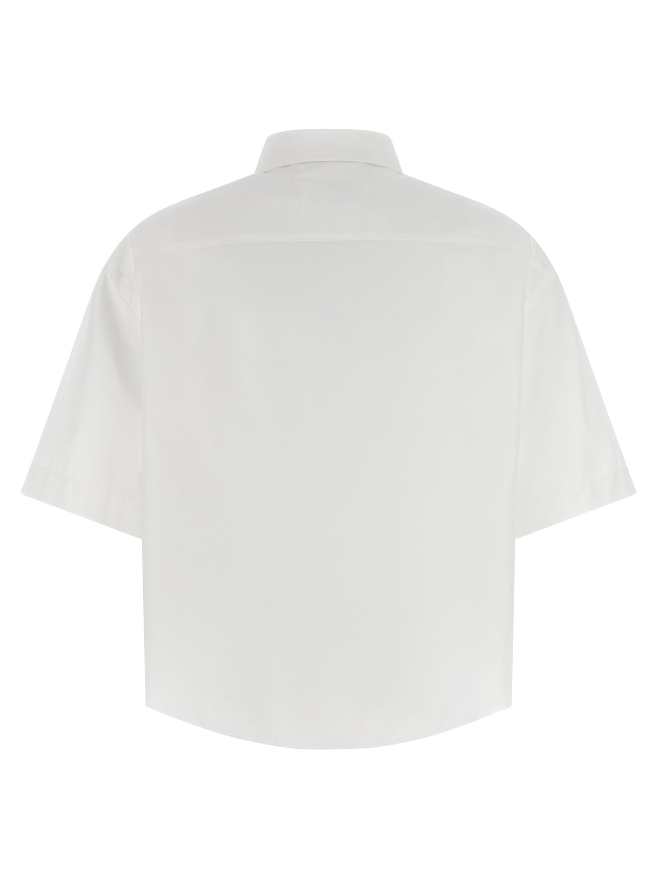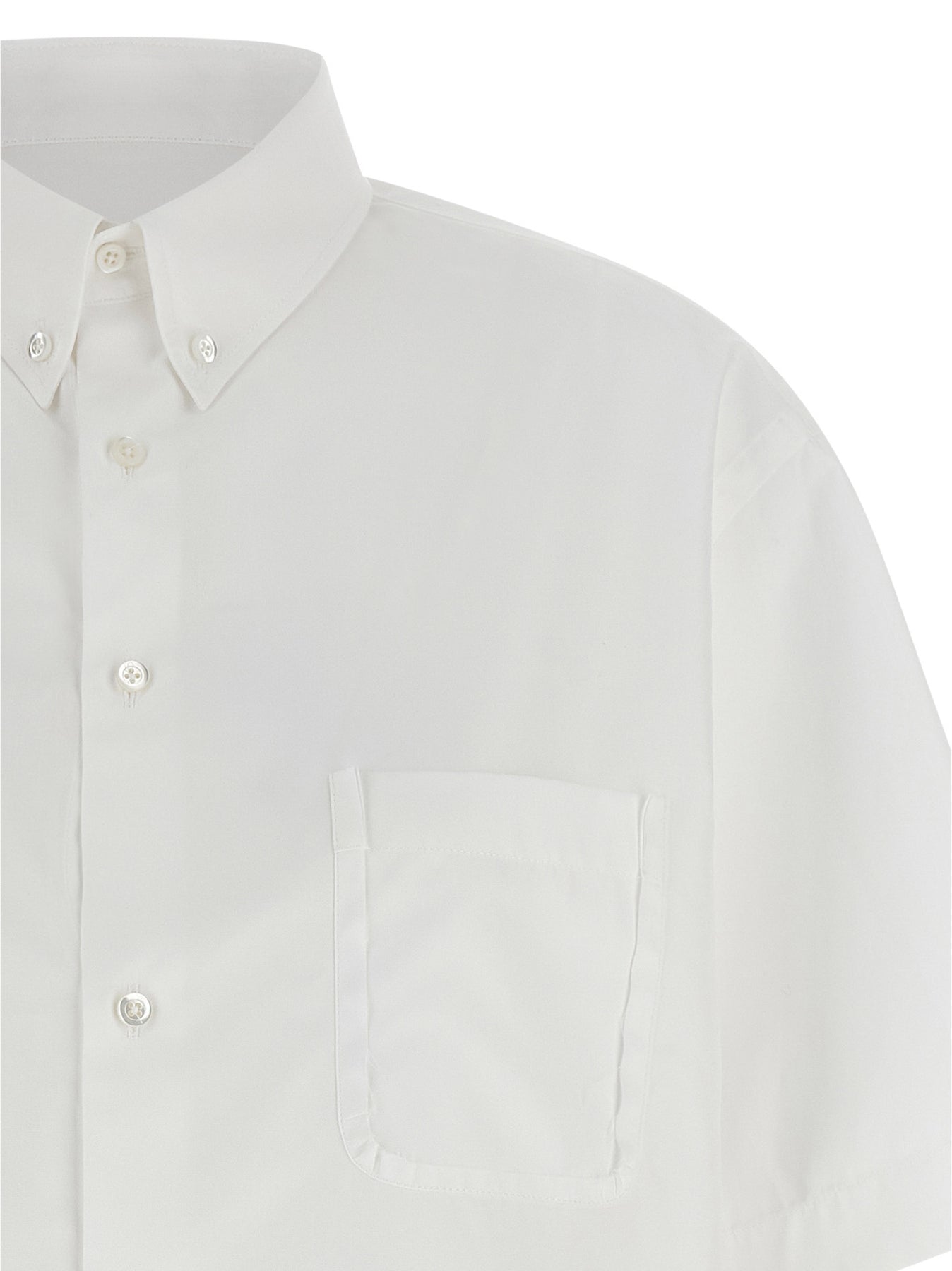 Cotton poplin shirt with dotton-down style, chest pocket, front button closure, short sleeves, asymmetric hem with raw cut hem, and 'Four Stitches' at the back.