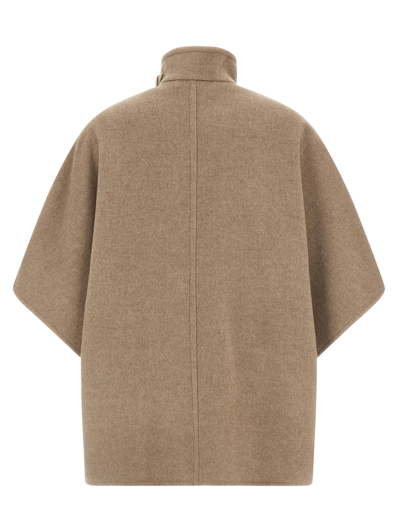 'Derrik' cape in double cashmere drap, slightly flared line, crater collar with leather strap closure, short wide kimono sleeves, front asymmetrical button closure, pockets, deep side slits with button.