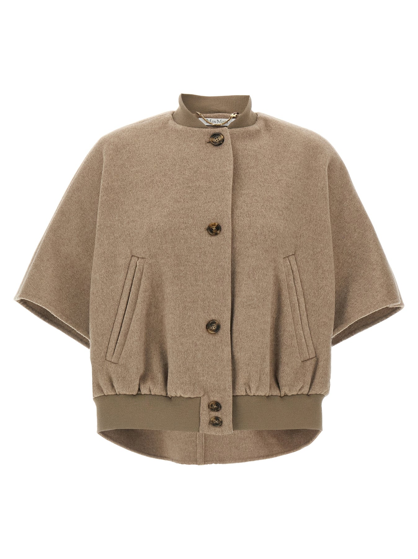 'Leticia' pure cashmere double drap cape with ribbed wool knit details, front button closure, pockets, wide short kimono sleeves, asymmetric hem, wide side slits with button.