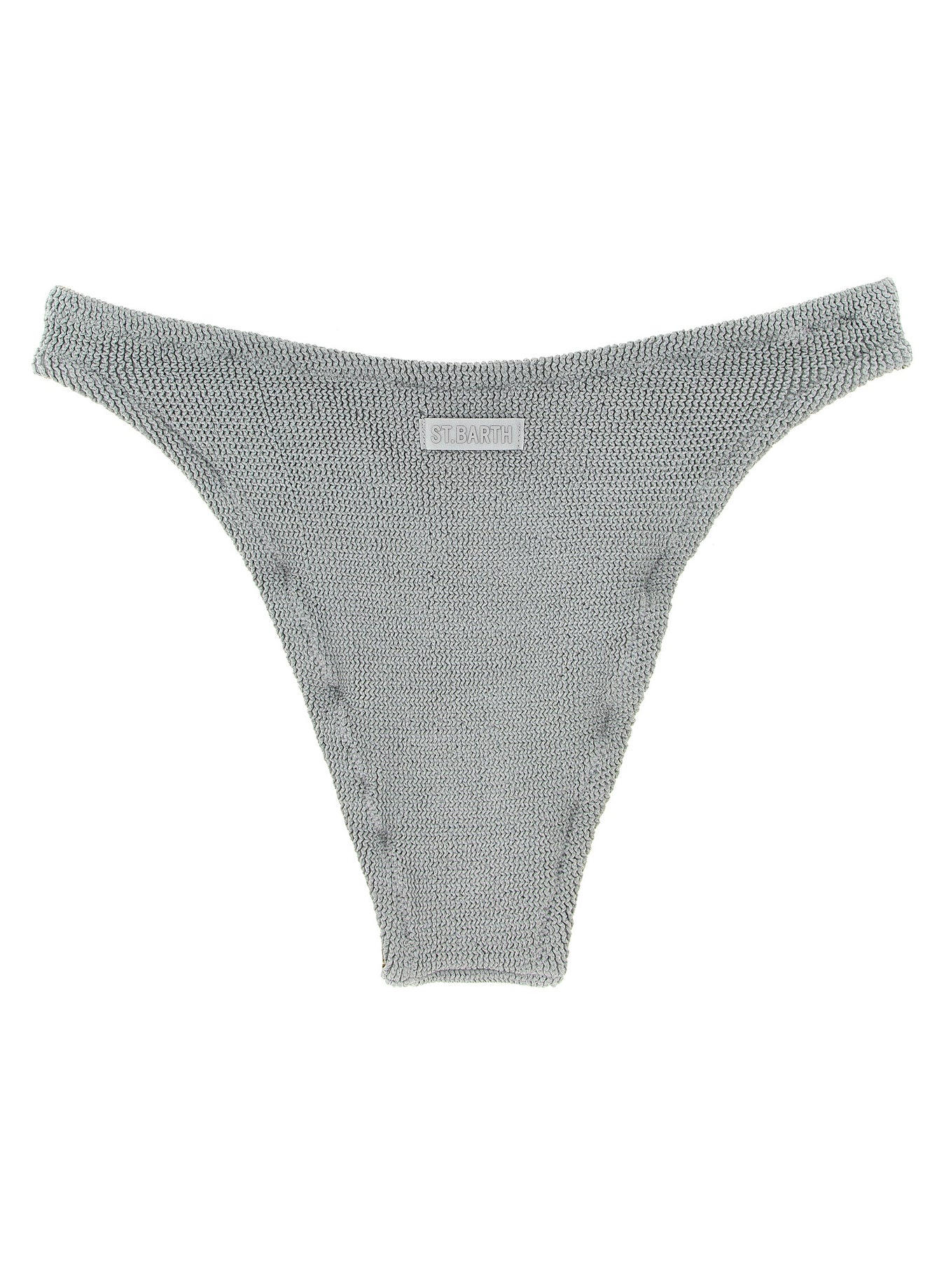 Elise' bikini bottoms in crinkle lurex fabric with back logo patch, and mid-leg cover at the back.