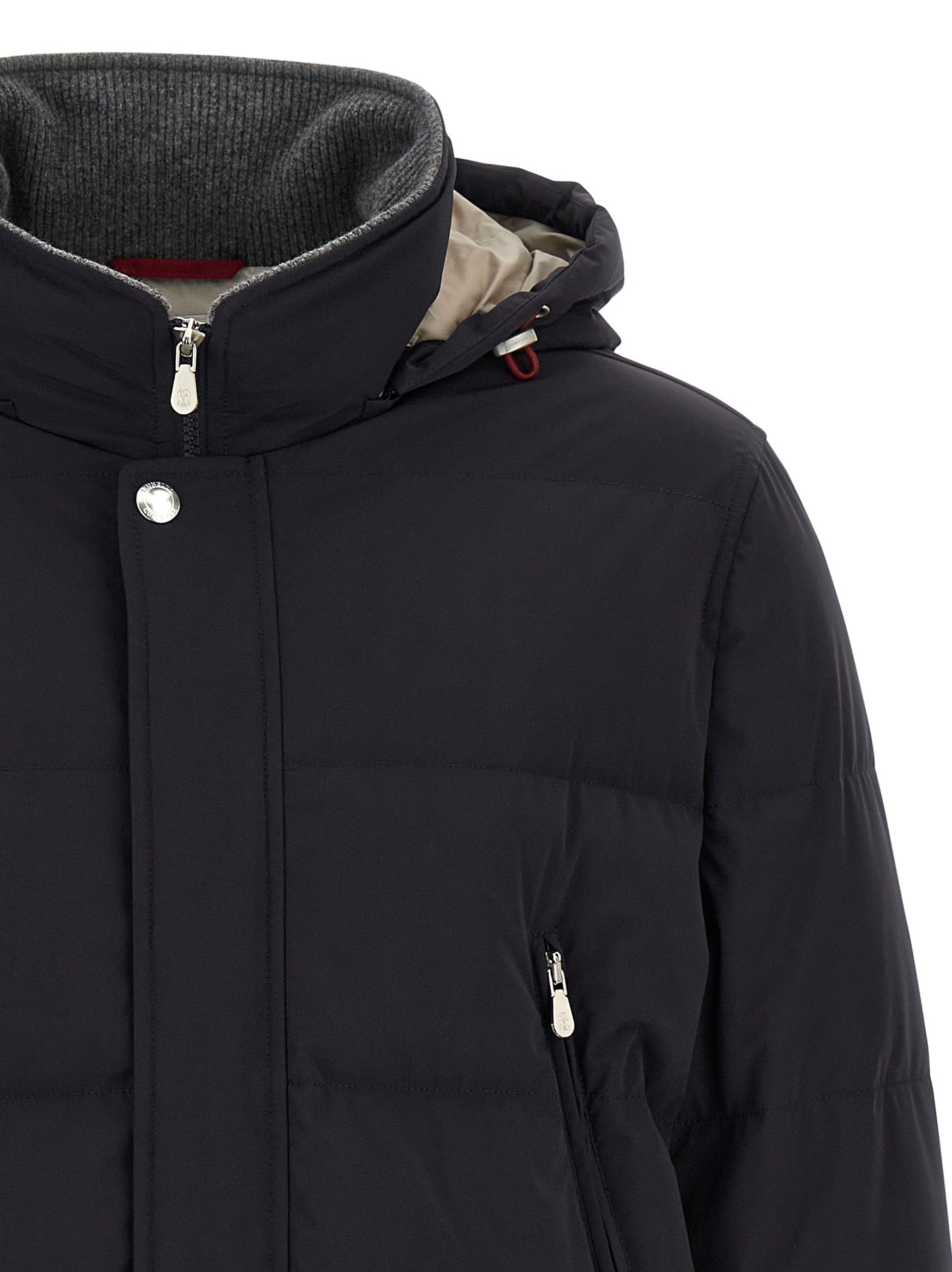 Quilted tech fabric jacket with water-repellent goose down padding with ribbed cotton knit inserts, adjustable and removable hood, standing collar, front zip and snap button closure, pockets, long sleeves with elastic cuffs, adjustable slits with back snap buttons.