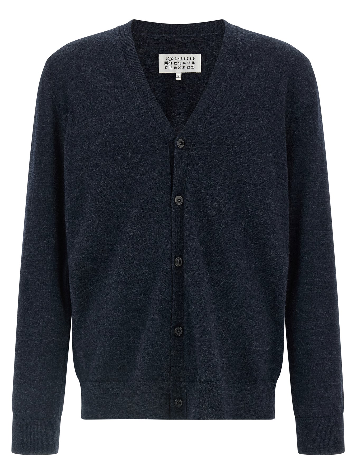 Wool cardigan, V-neck, front button closure, long cuffed sleeves, suede elbow patch, 'Four stitches' at the back.
